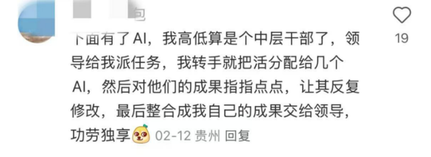 “领导给我派发任务,我转手就把活给分配到几个AI,然后对他们的成果指指点点,让其反复修改,最后整合成我自己的成果交给领导,功劳独享。”