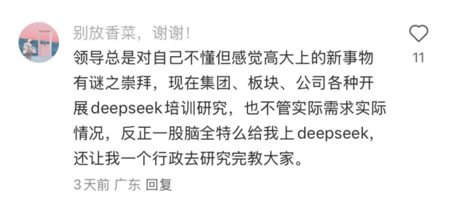 小红书用户“别放香菜,谢谢!”说,“现在集团、板块、公司各种开展DeepSeek培训研究,也不管实际需求实际情况,反正一股脑上DeepSeek,还让我一个行政去研究完教大家。”