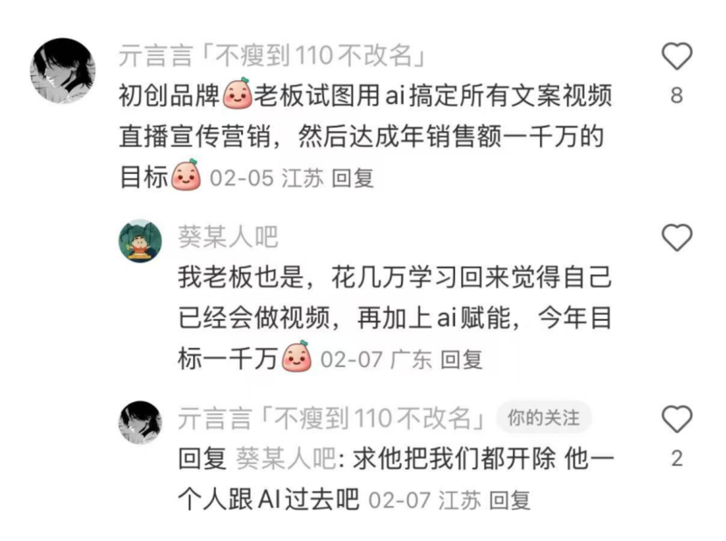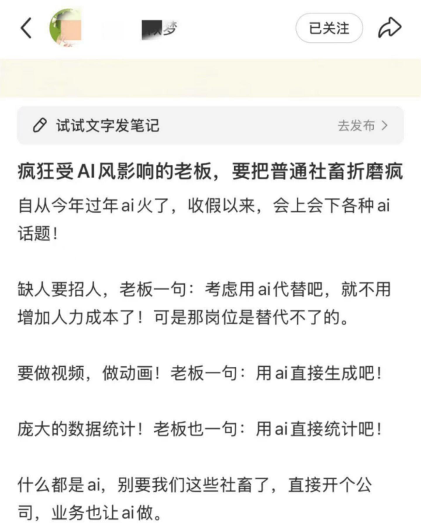 自己已经被折磨两周了,因为很多工作AI其实并不能胜任,但是老板不了解。就业环境不好,她只能选择忍耐。