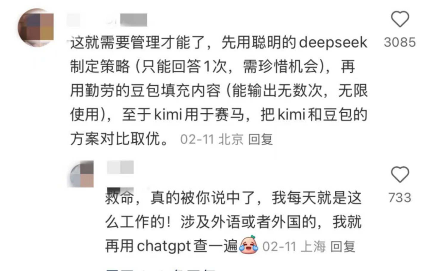 高阶版:先用聪明的DeepSeek制定策略(只能回答一次,需珍惜机会),再用话痨附体的豆包填充内容(能输出无限次,无限使用),至于劳模Kimi用于赛马,把Kimi和豆包的方案对比取优。