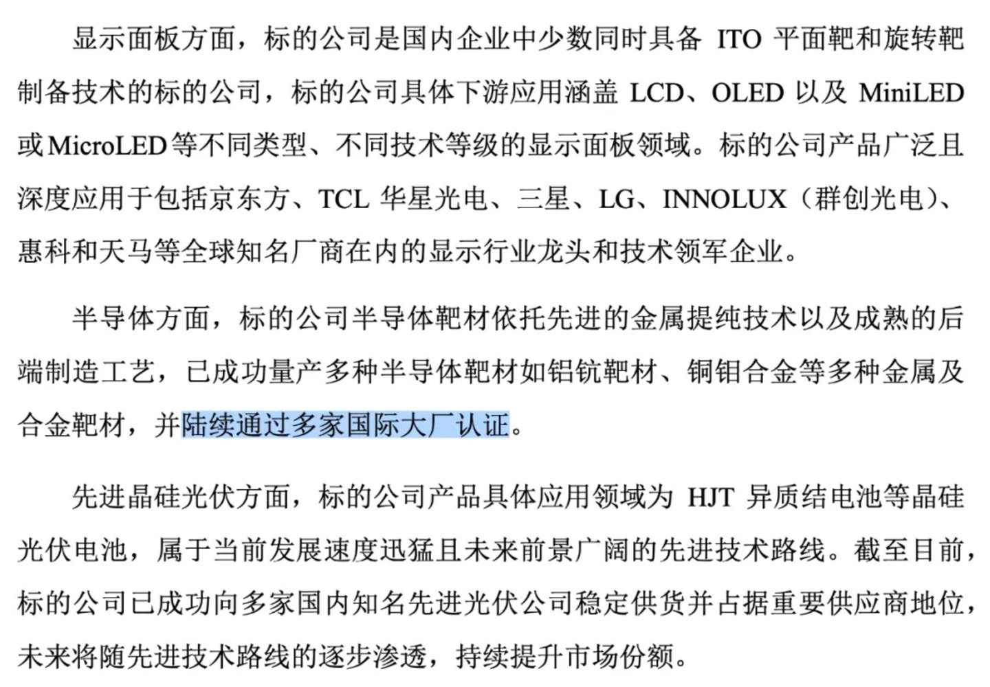 钛媒体APP调研发现,先导电科表现出的增速大幅放缓与其选择的核心业务不无关系。据重组预案披露,先导电科的主要产品是ITO靶材,该领域如今正面临“成熟市场下的转型压力”,而在真正属于高成长性赛道的半导体靶材领域,先导电科仅处在“陆续通过多家国际大厂认证”阶段,意味还没有产品落地。