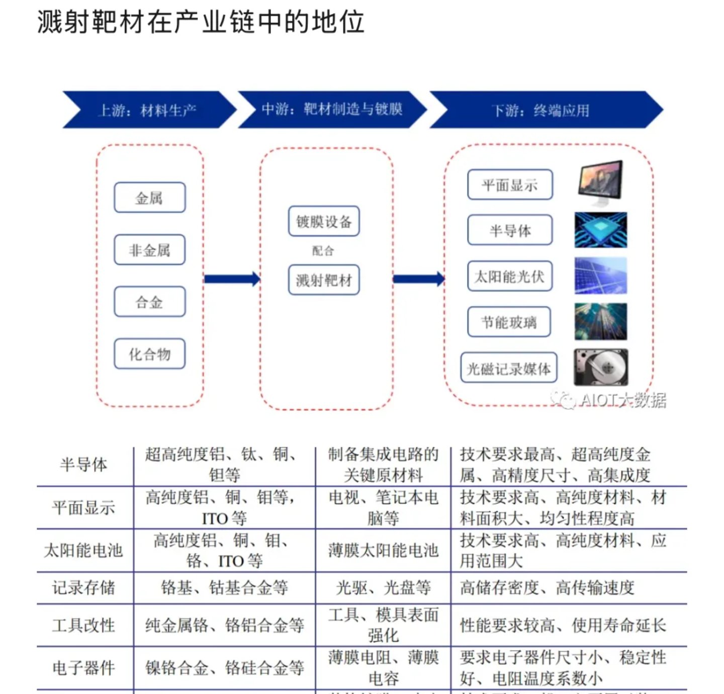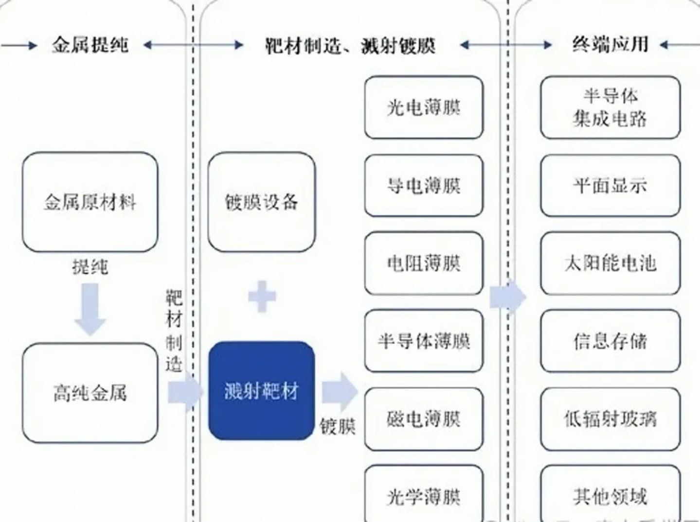 靶材是现代工业制造中关键一环,它通过溅射技术为显示面板、光伏、半导体等工业化制备功能性薄膜,更换不同靶材可得到不同的膜系,以实现导电或阻挡等功能。