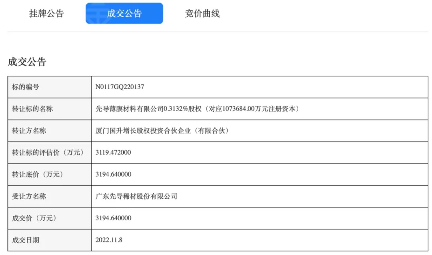 挂牌转让时,其持有该股权时间尚不足一年。挂牌期满,2022年11月8日,广东先导稀材股份有限公司作为受让方回购了这份股权,回购价3194万元,是107万资本金的约30倍。