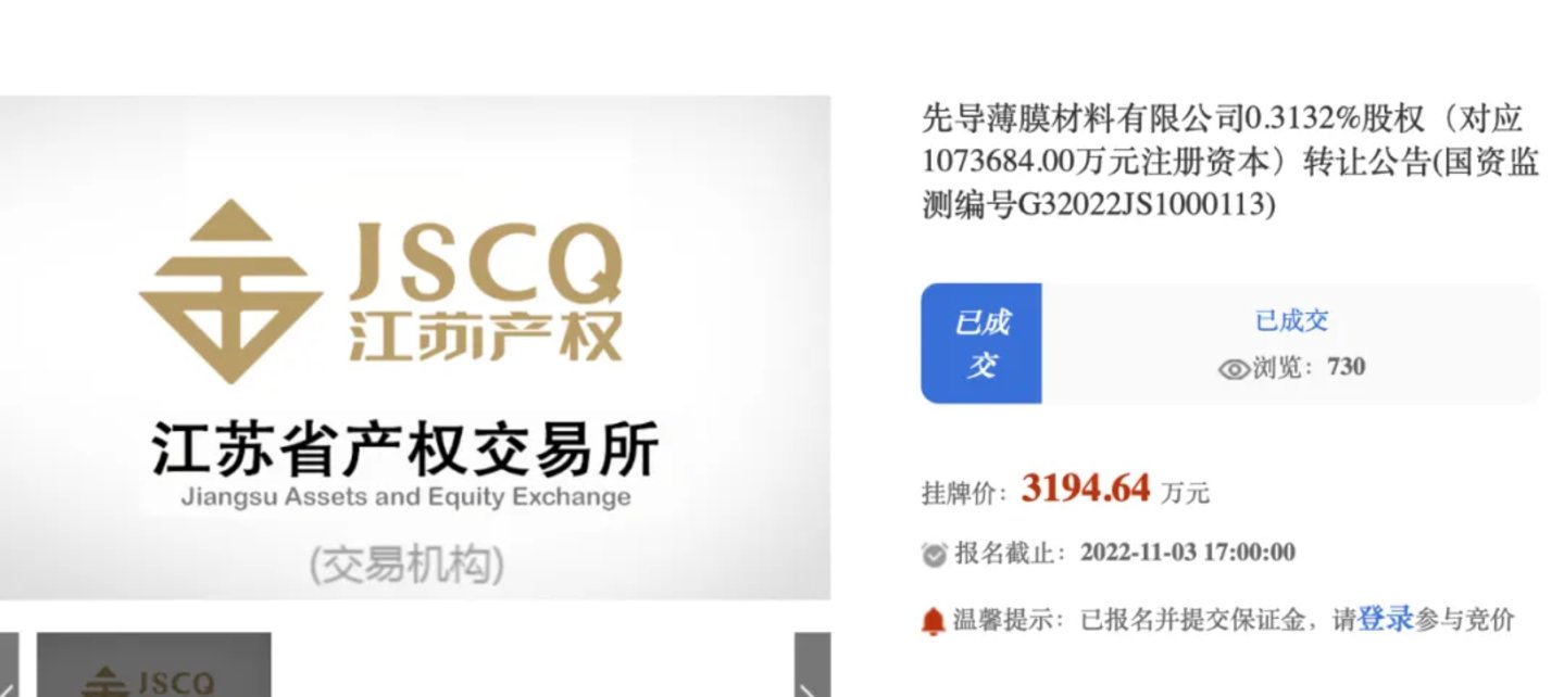 当年“国庆黄金周”过后,10月8日,江苏产权交易所挂出一则转让公告,标的是先导薄膜材料有限公司0.3132%股权。这份股权持有者是厦门国升增长股权投资合伙企业(有限合伙),其为A轮参投方之一。