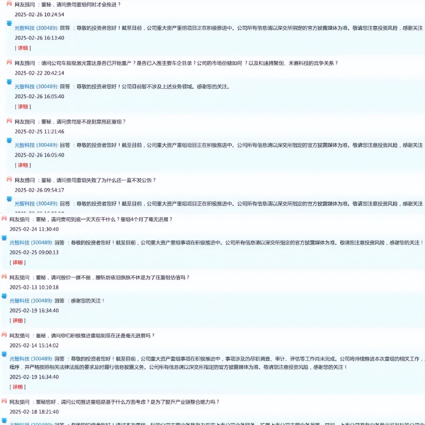 现在,曾经“风风火火、急不可耐”的首单却正遭遇“千呼万唤难出来”的尴尬。从公告至今的半年时间里,投资关系互动平台上,光智科技被问及最多的莫过于重组推进情况,频次之高A股罕见。随着时间推移,提问也从进度问询逐渐发展到质疑甚至愤怒。