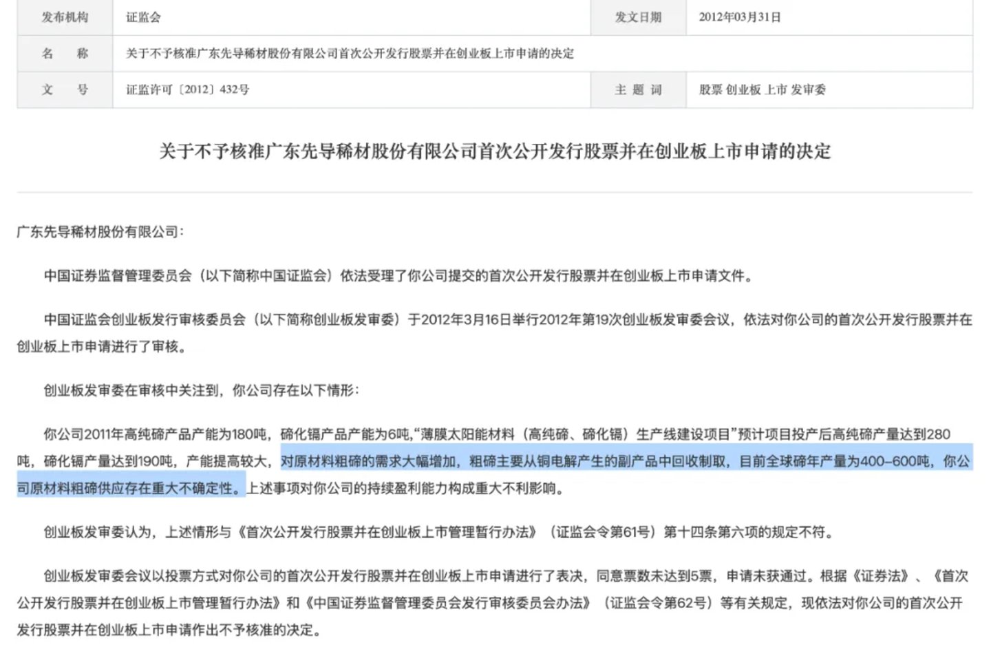 于是,2012年3月,创业板发审委对先导稀材给出了这样的答复:“粗碲主要从铜电解产生的副产品中回收制取,目前全球碲年产量为400-600吨,你公司原材料粗碲供应存在重大不确定性。”