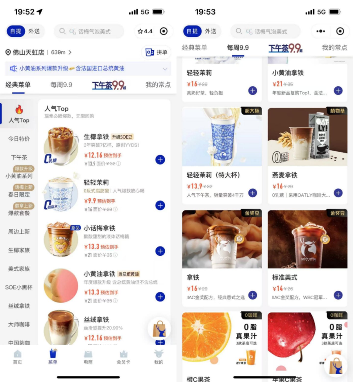 原来打开瑞幸小程序就会弹出的“9.9优惠券”已经消失,取而代之的是“每周9.9”专区,虽然仍提供9.9元的咖啡,但品类已不足10个。