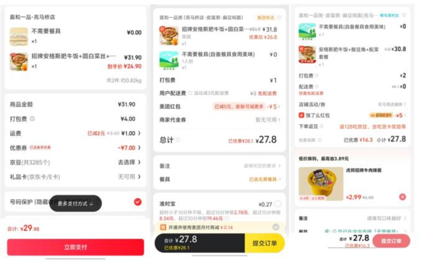 图: 三款外卖软件同款产品价格(从左到右: 京东、美团、饿了么),来源: 外卖软件APP