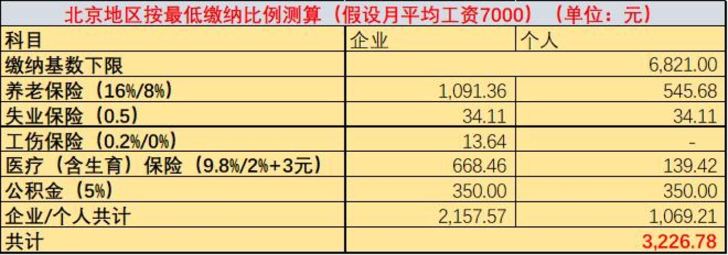 我们以北京地区最低缴纳比例做个简单的测算,分两种情况: