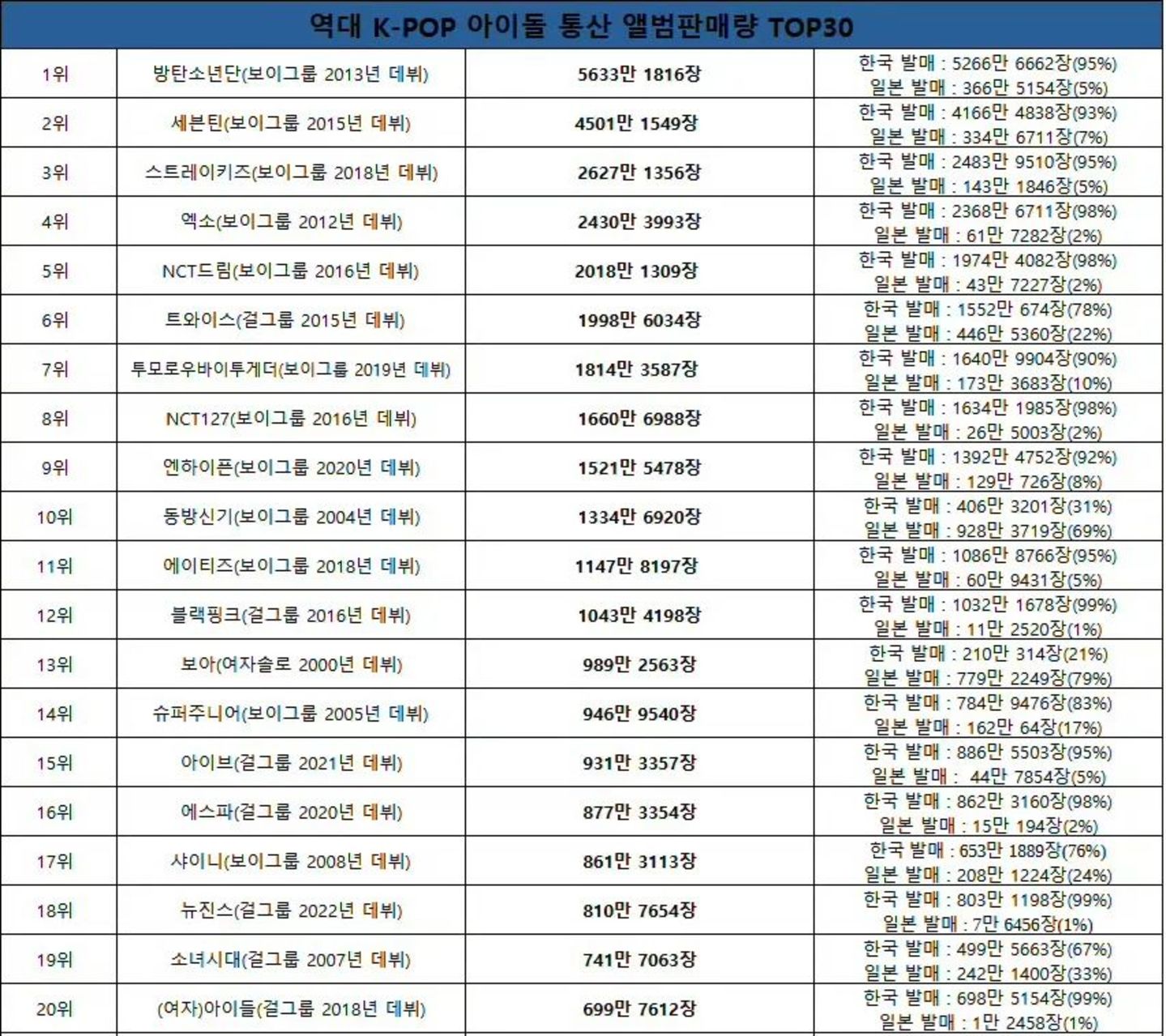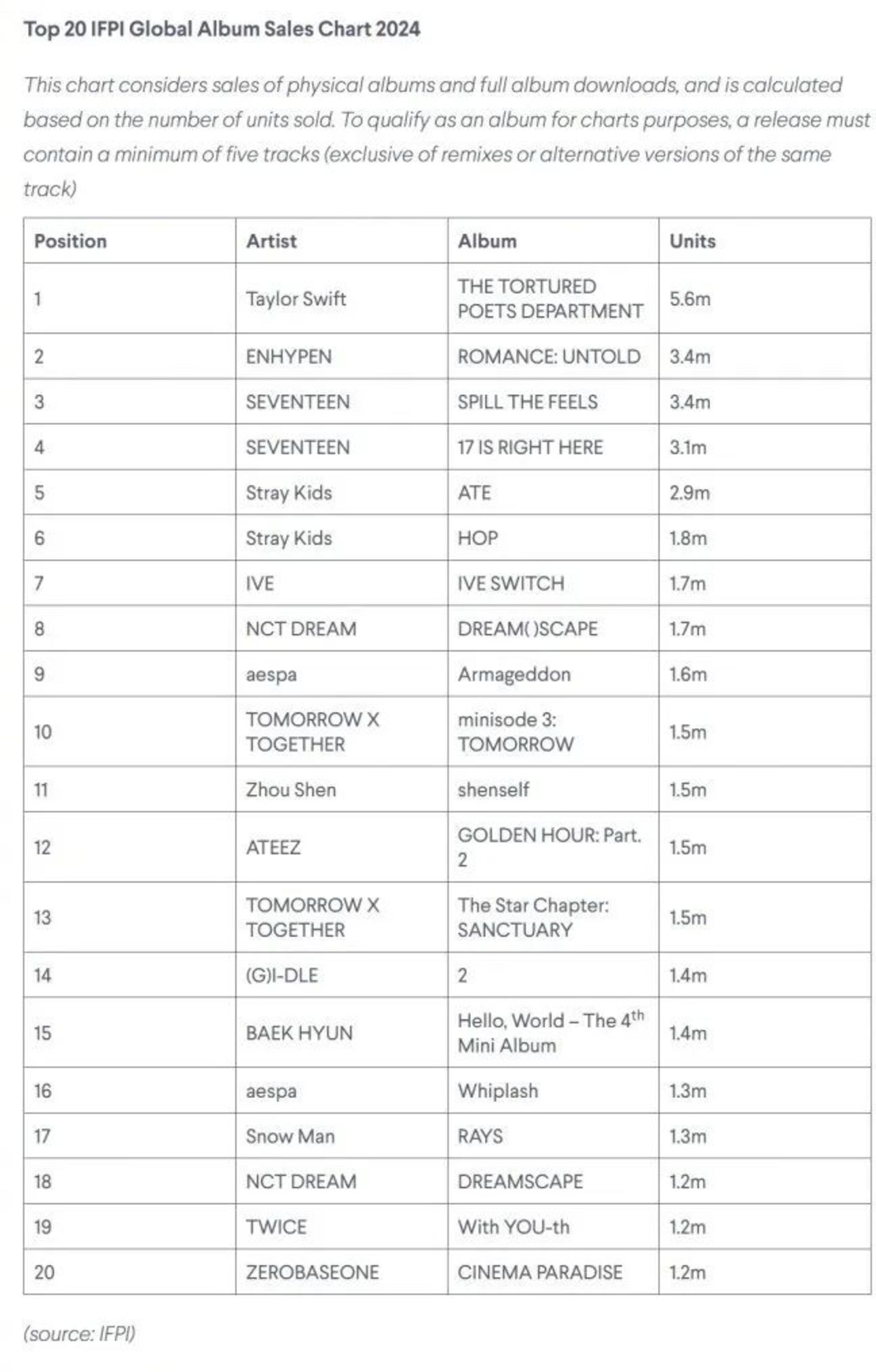 以截止到去年12月底的历代K-Pop艺人累计专辑销量TOP 20数据来看,便有BTS 、SEVENTEEN、Stray Kids等11组(含7人及以上)大型团位列其中,而精确到前五名则均为大型团。根据IFPI公布的去年全球畅销专辑实销榜显示,排名前20的畅销专辑便有10组来自于ENHYPEN、SEVENTEEN等K-Pop大型团。值得一提的是,J-Pop唯一上榜的Snow Man也同样为男子大型团配置。