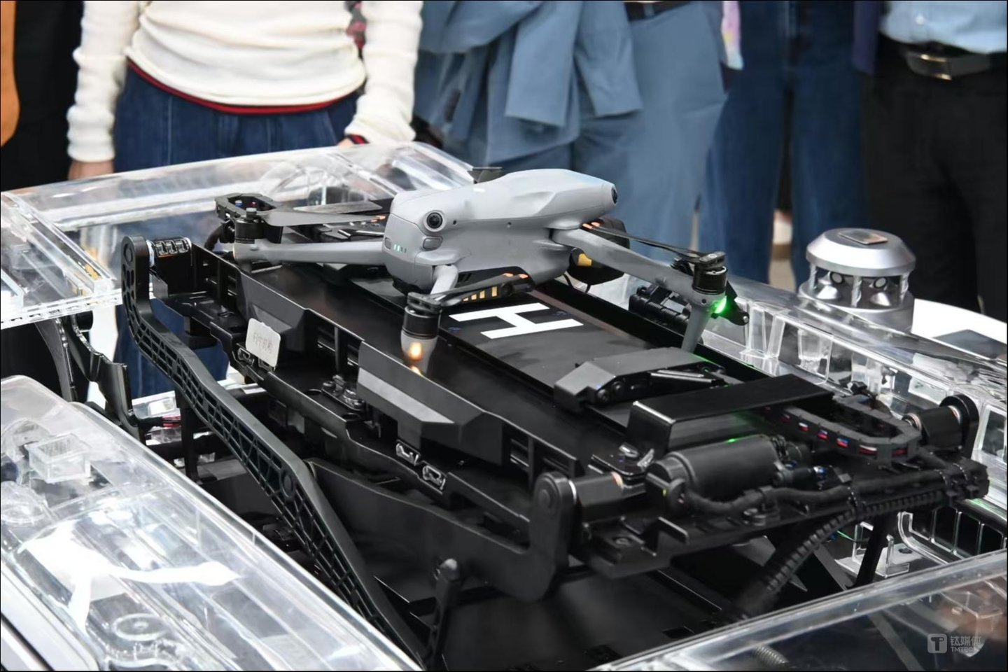 为了能够实现车顶收纳+充能、起降,“灵鸢”运用了车载伸缩停机坪方案,融合了车载无人机定位模块、4K高清车顶摄像头、定制双模式手柄等硬件,能实现一键返舱、随动跟拍、收纳快充等功能。