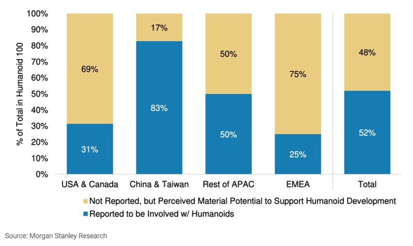 近期,摩根士丹利发布研报《Humanoid 100》,对全球人形机器人产业链100家核心上市公司进行梳理,从总体数量分布来看:中国占35家,美国和加拿大占35家,亚太其他地区占18家,欧洲、中东和非洲地区占12家(主要为欧洲企业)。