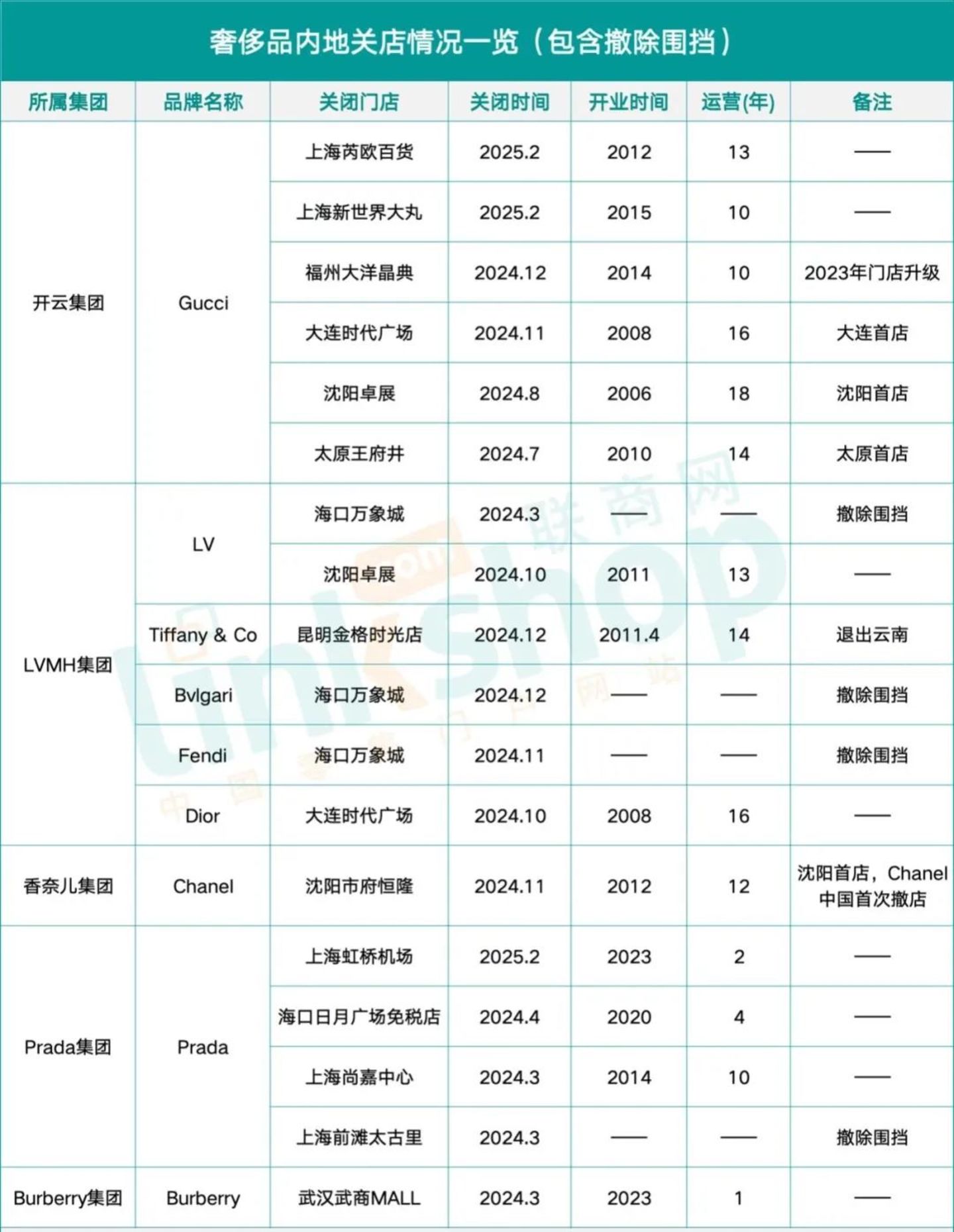 据联商网不完全统计,2024年至今,六大顶奢品牌在中国内地市场关闭了14家门店(包含撤除围挡)。