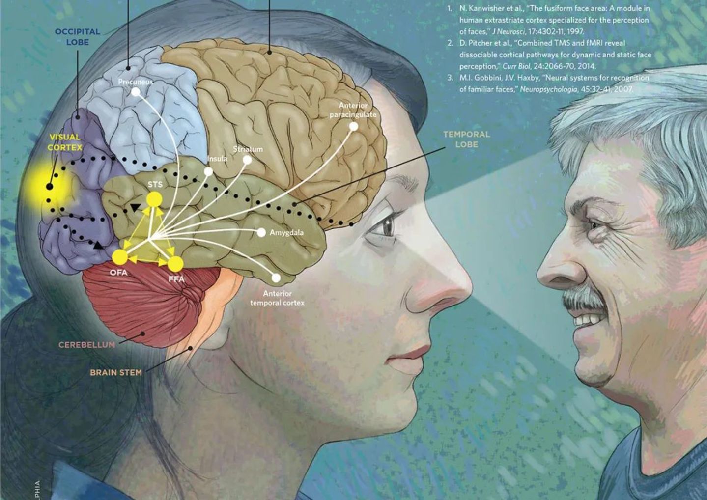 肖恩·卡罗尔:那我们来谈谈大脑最令人印象深刻的能力之一——面孔识别。很明显我们需要具备识别面孔的能力,那么大脑中有特定的区域负责这个功能吗,还是说这个功能分布在不同的区域?