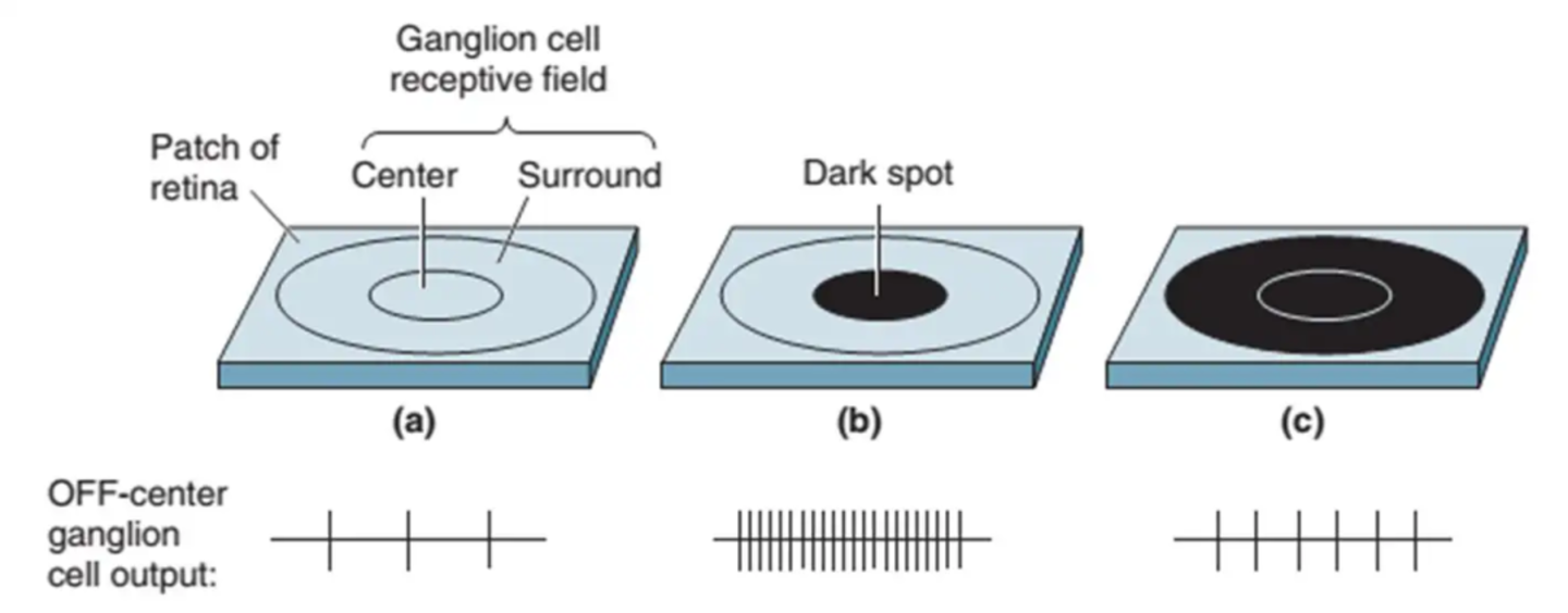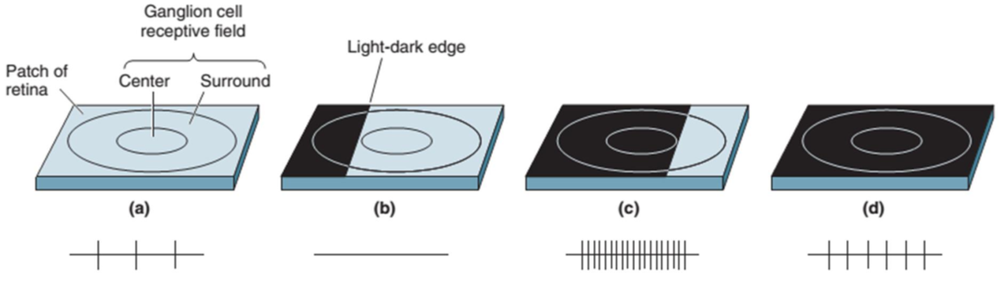 ▷黑色为光线照射区域,竖条是细胞发放的频率,光线只照射感受野中心(center)的时候细胞发放频率最高,照射整个感受野的周边(surround)时候发放频率却降低了(上图)。当明暗的边缘正好在感受野的“中心-周边”边缘时,细胞电位发放或急剧降低,或急剧升高。即这种机制可以让视觉细胞对边缘敏感。将边缘信息提取出来交给高级皮层处理。图源:Neuroscience Exploring the Brain,知乎。