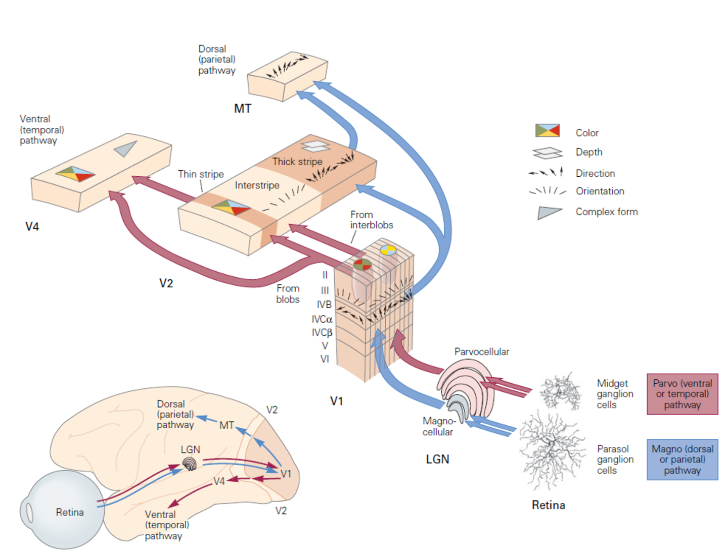 ▷红色:腹侧通路,蓝色:背侧通路。来源: Principles of Neuralscience