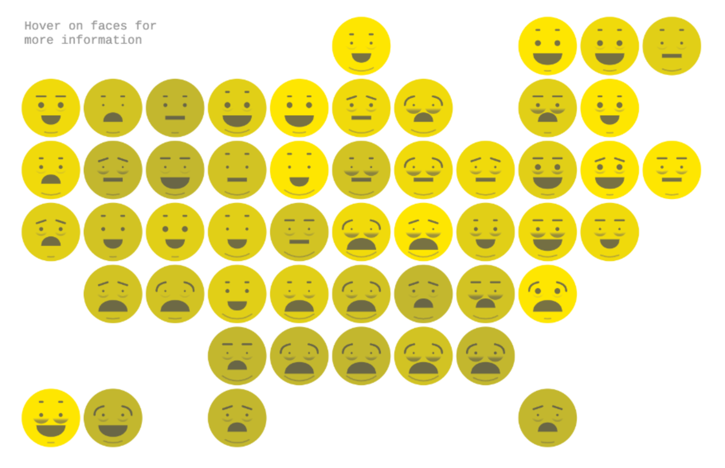 ▷切尔诺夫脸,以人脸形状展示多元数据。各个部分,如眼睛、耳朵、嘴巴和鼻子,通过形状、大小、位置和方向来表示变量的值。使用人脸背后的理念是,人类容易识别面孔,并且能够轻松地注意到细微的变化。图为一种2017美国切尔诺夫脸,其中眉毛越矮越细,失业率越低,眼睛大小与教育水平相关,眼袋的大小告诉我们有多少成年人每晚至少睡七小时,下巴越大,肥胖率越高等。来源: Lazaro Gamio: The Emoji States of America