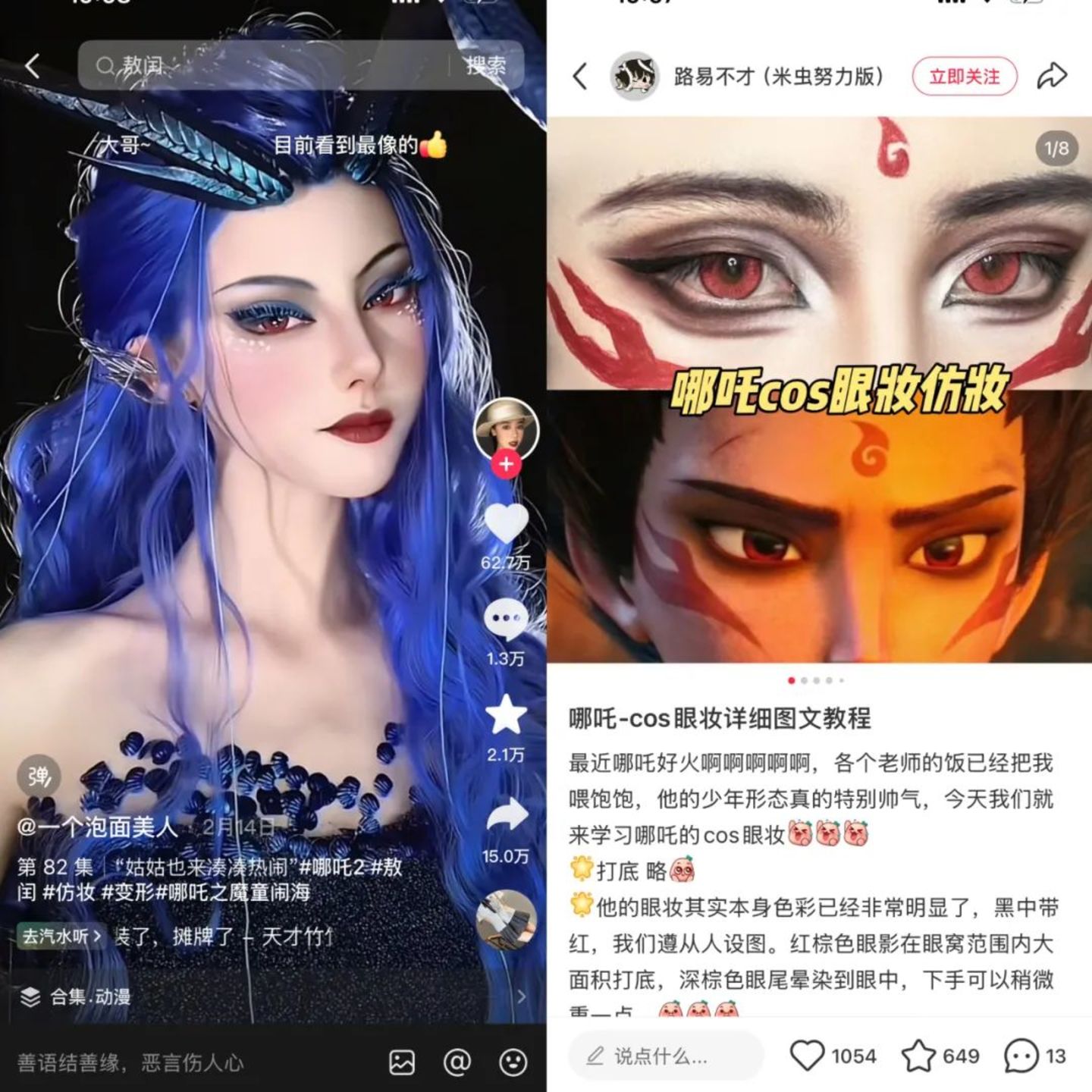 就拿两个平台都很火的“哪吒仿妆”来说,抖音相对侧重卡点上妆一键切换的爽感,小红书则有更多细节教程,以教会别人为目的。