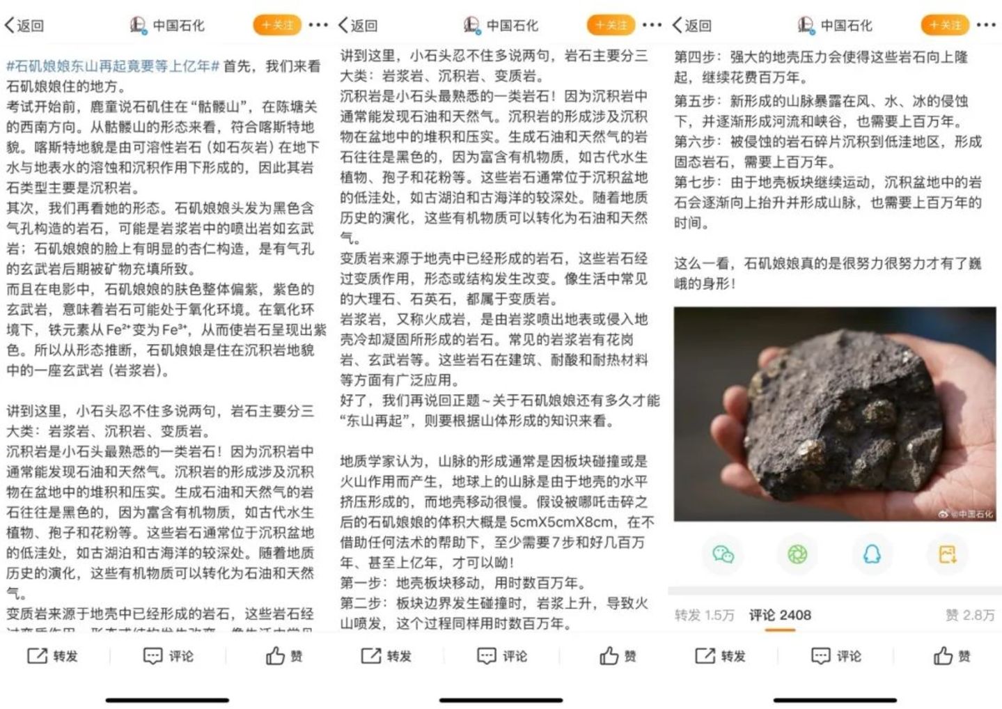 比如电影中变小的石矶娘娘不仅形象可爱,那句用软糯口音说的“留得青山在,不怕没柴烧,臭小子,给老娘记着”也给人留下深刻印象。而@中国石化 以地质学专业分析判断#石矶娘娘东山再起竟要等上亿年#,既有科普干货,情绪浓度也拉满。