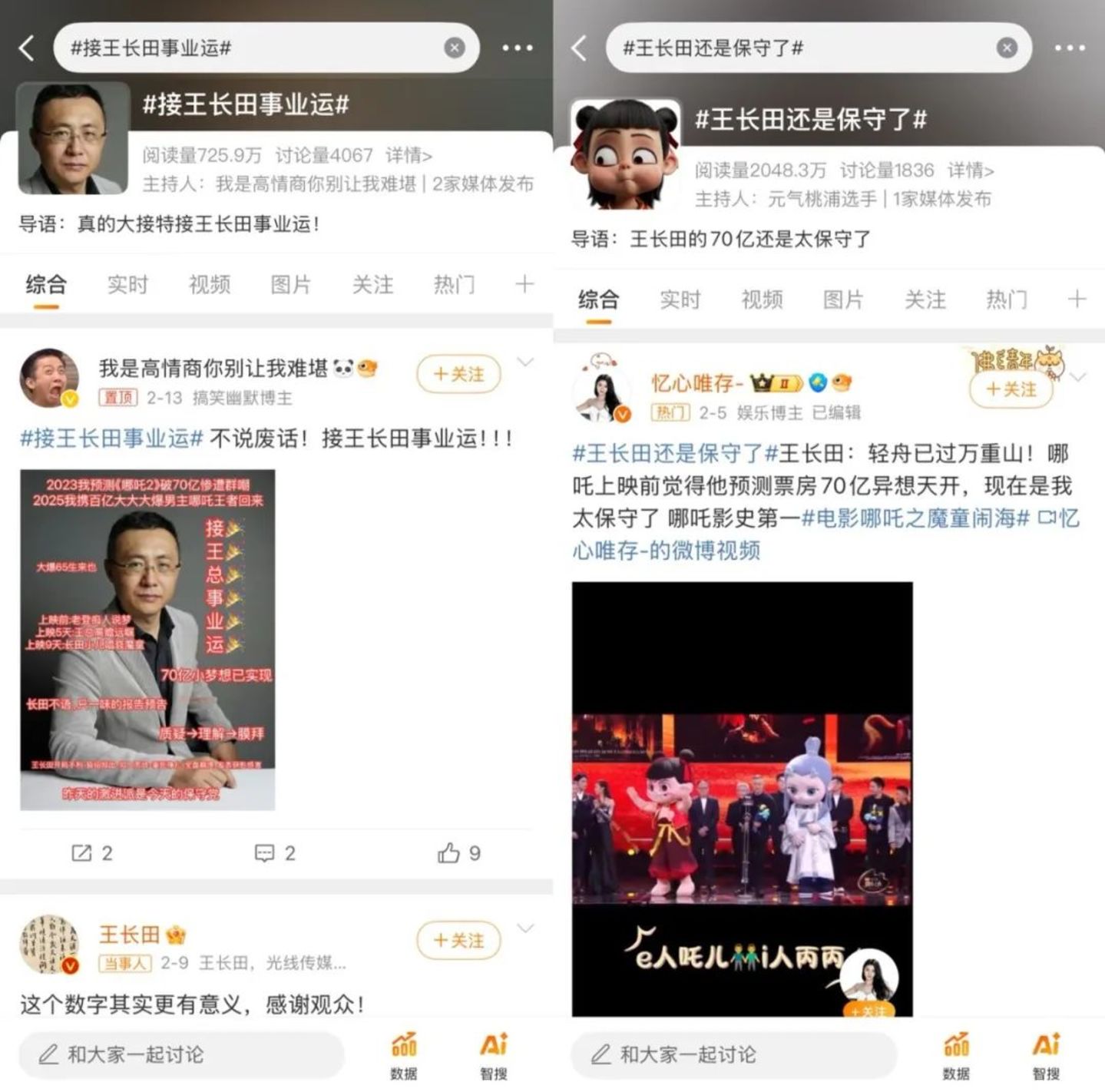 比较有趣的是,不仅电影本身台词、角色梗,主创团队幕后梗也频频登上热搜。比如光线董事长王长田预测哪吒票房70亿,随着电影票房走势变化引发截然不同的观感,“王长田还是保守了”等梗图背后,是对票房成绩的集体狂欢;很多网友开始在职场、投资等话题下留言“接王长田事业运”等。