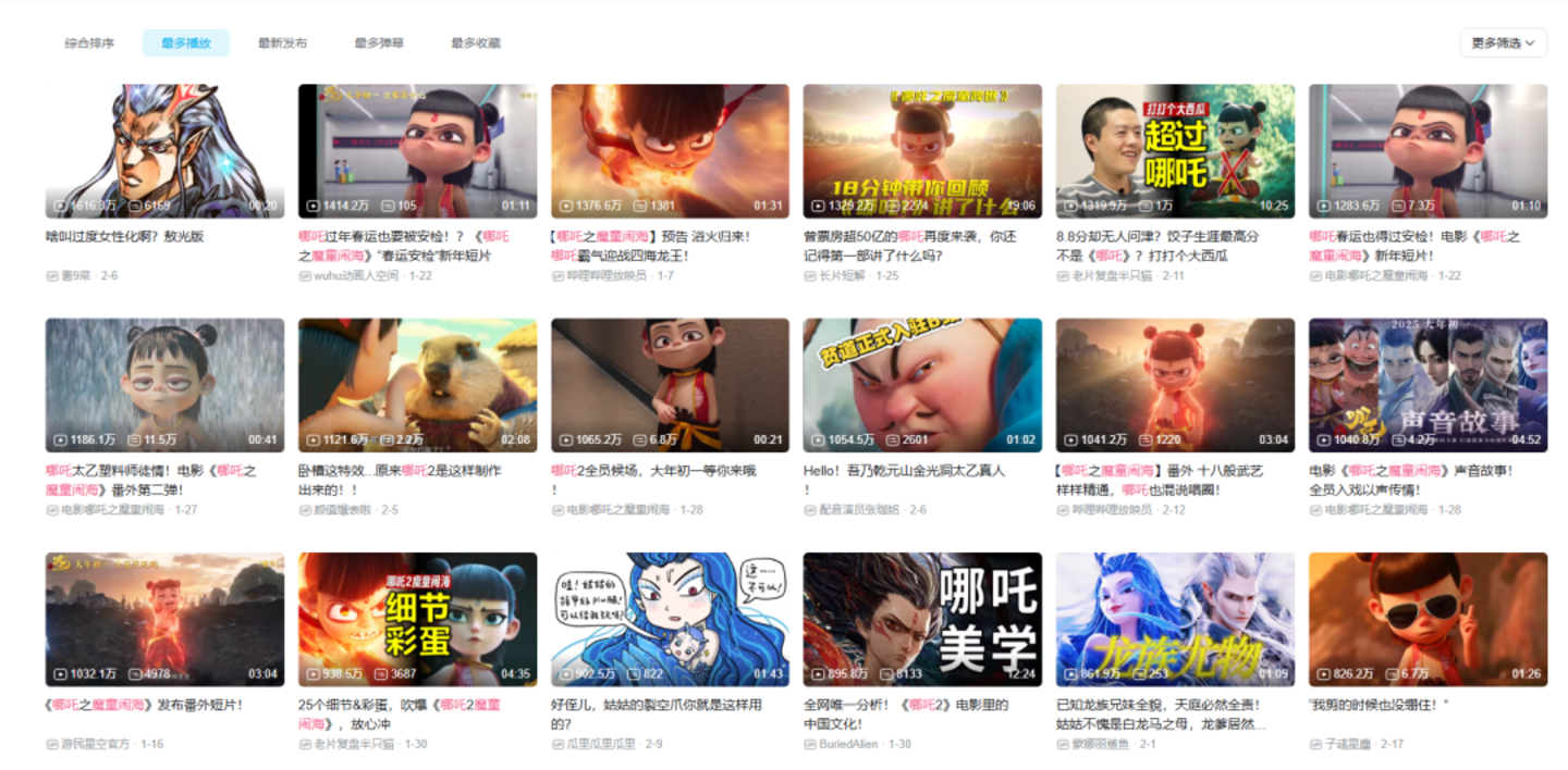 B站作为PUGC为核心的平台,涌现了大量深度二创视频,包括电影解析、高燃混剪、同人曲和同人动画手书等等,帮助电影建立了IP化开发与IP粉丝经济的生态基础。尤其《哪吒2》上映后,5年前《哪吒1》的二创视频翻红,深厚的内容储量对新人入坑十分友好,也是电影IP延续性与生命力的体现。