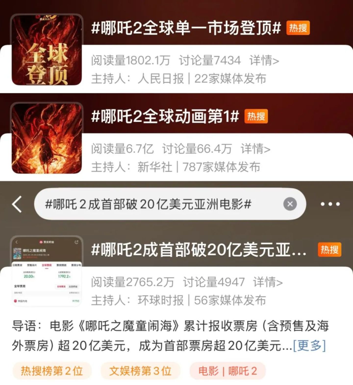 而在微博,热搜为《哪吒2》的全民关注提供了一个聚合场景,#哪吒2中国电影票房第一# #哪吒2单一市场票房第一# #哪吒2动画影史第一#……递进式的热搜词条不断推高大众的自豪情绪。