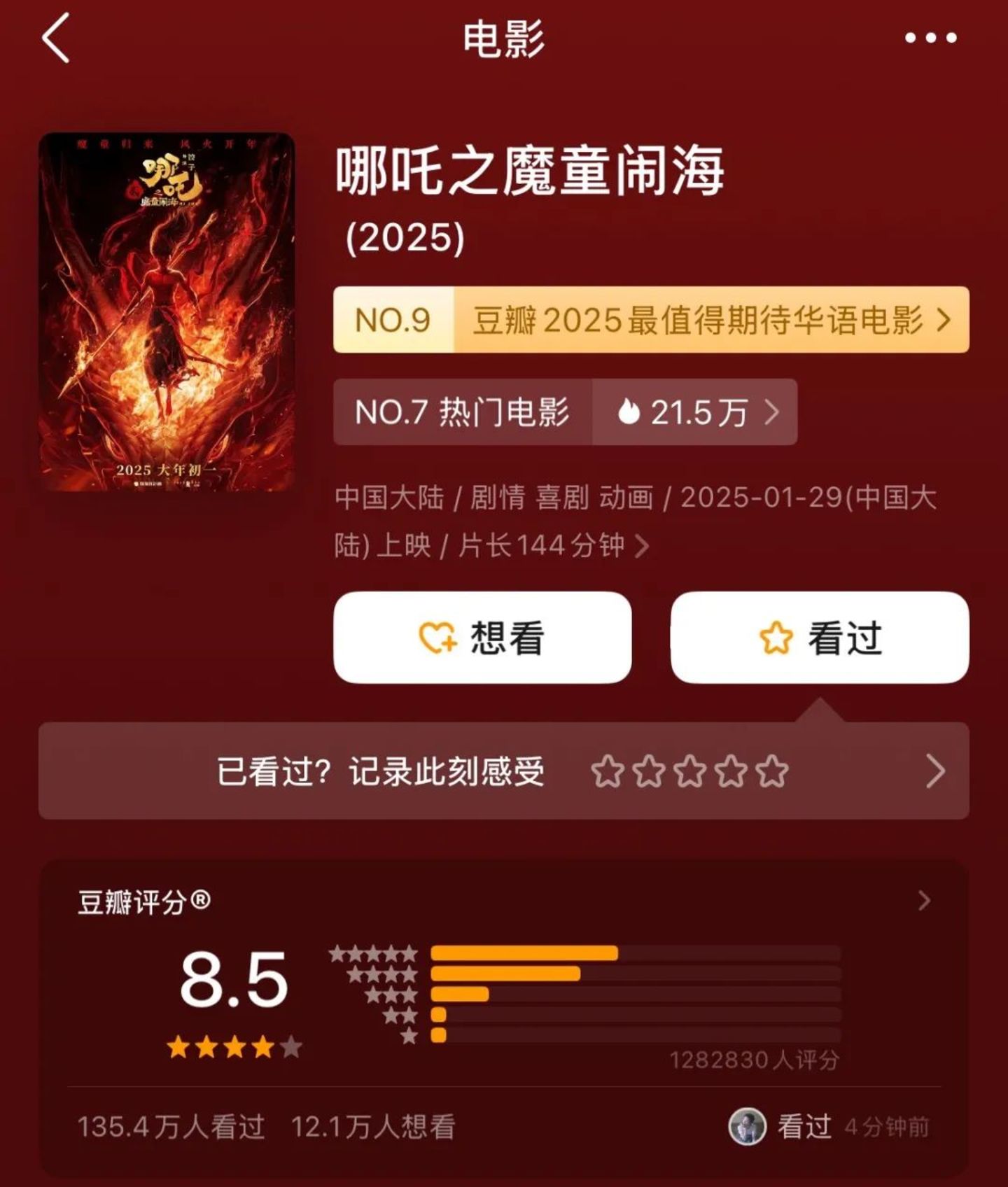 典型如豆瓣和B站。前者作为文化社区,聚集着大量电影爱好者。豆瓣评分和短评,也是重要观影决策指导。《哪吒2》以8.5的分数在春节档电影里断层领先,是电影口碑和关注度最直接的佐证。