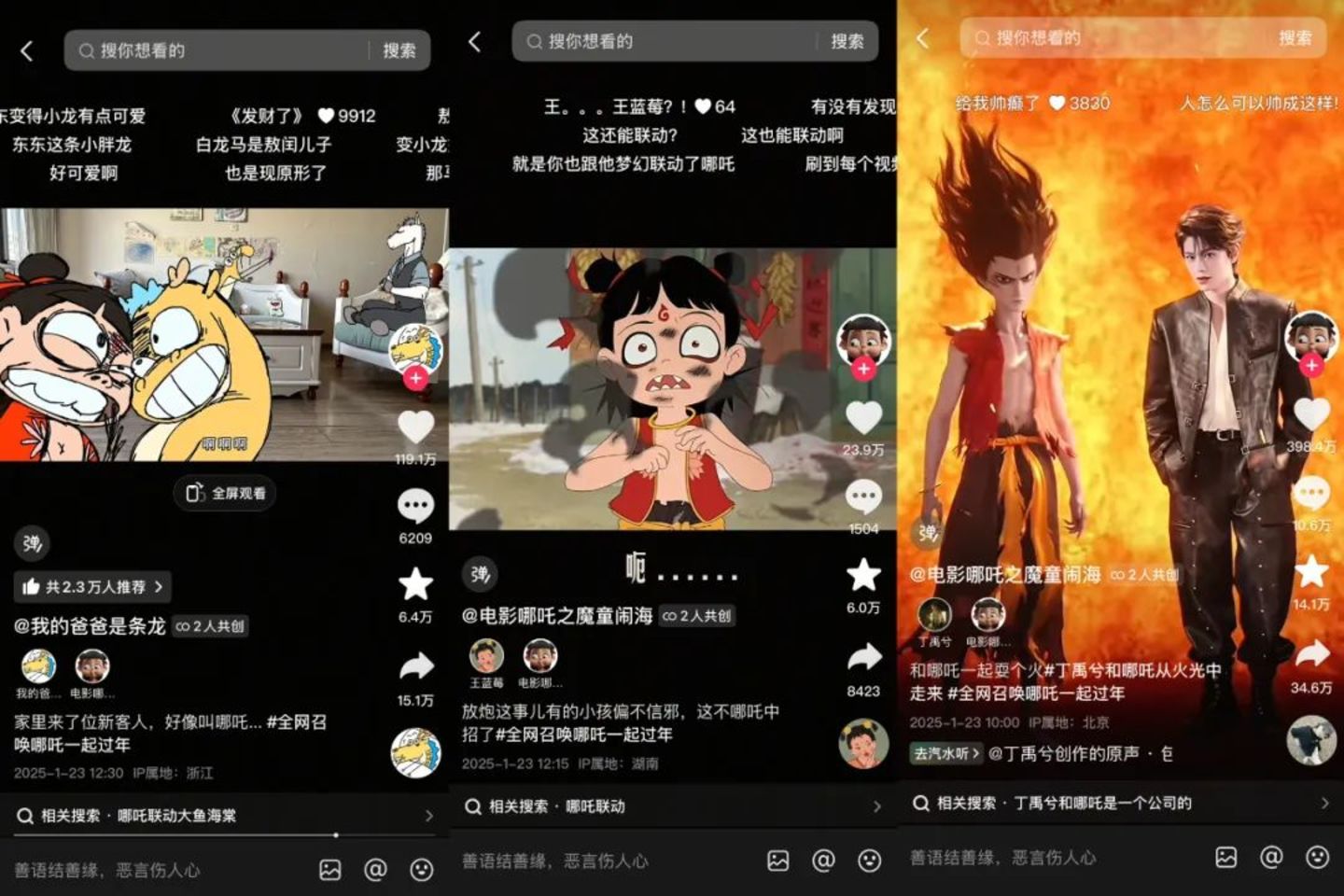 《哪吒之魔童闹海》正式上映前,就在抖音平台与多个账号发起“共创”,包括动画电影《深海》《茶啊二中》,动漫IP大理寺日志、我的爸爸是条龙,头部动漫自媒体米雷RayDog、王蓝莓,光线旗下艺人丁禹兮、任敏等等。