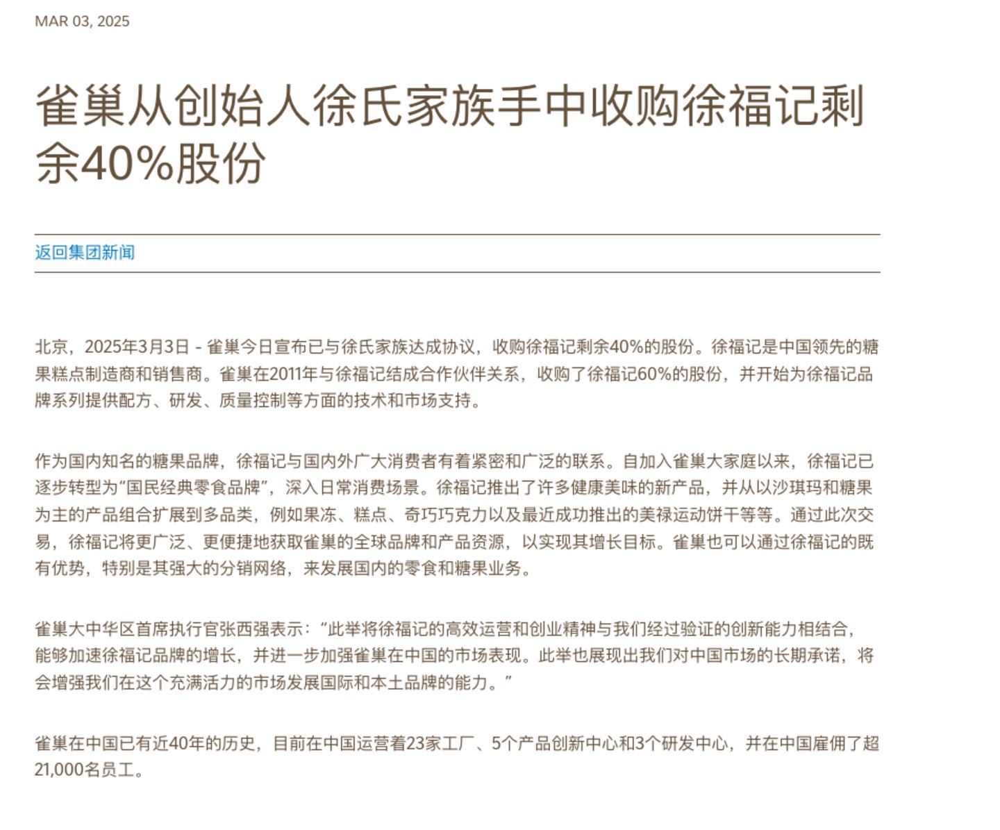 3月的第一个工作日,雀巢宣布已与徐氏家族达成协议,收购徐福记剩余40%的股份。早在2011年,雀巢就以17亿美元的价格收购了徐福记60%的股份。如今,徐福记将成为雀巢旗下的全资子公司。
