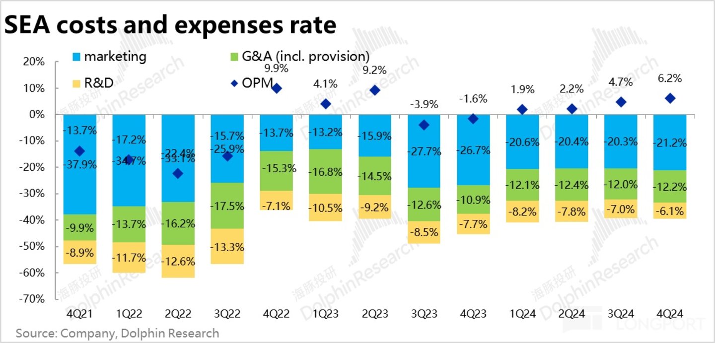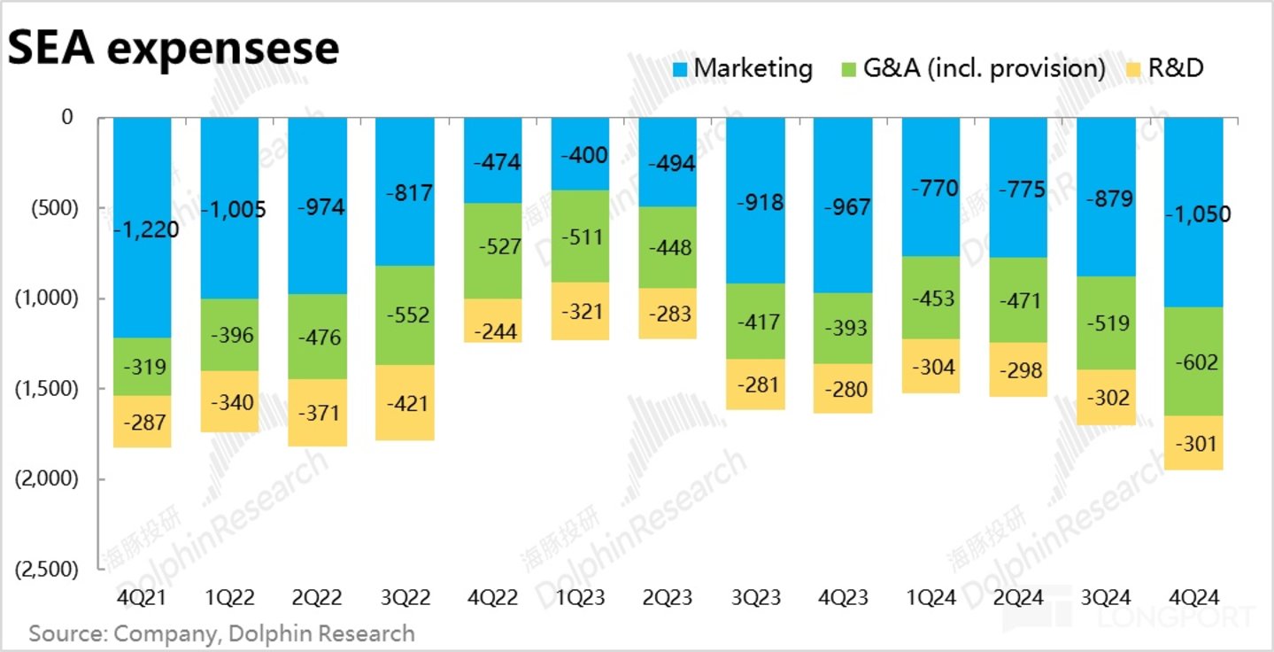 变现率上,Shopee平台的变现率本季环比的提升幅度仅 0.1pct,是 4Q23 以来单季提升幅度最小的一次。不过,高利润的 marketplace 变现率仍环比走高了 0.4pct,主要是 VAS(如配送费)等利润空间较低的变现率走低了 0.3pct。因此虽然本季变现率提升幅度缩窄,但对利润的影响却不会很大。
