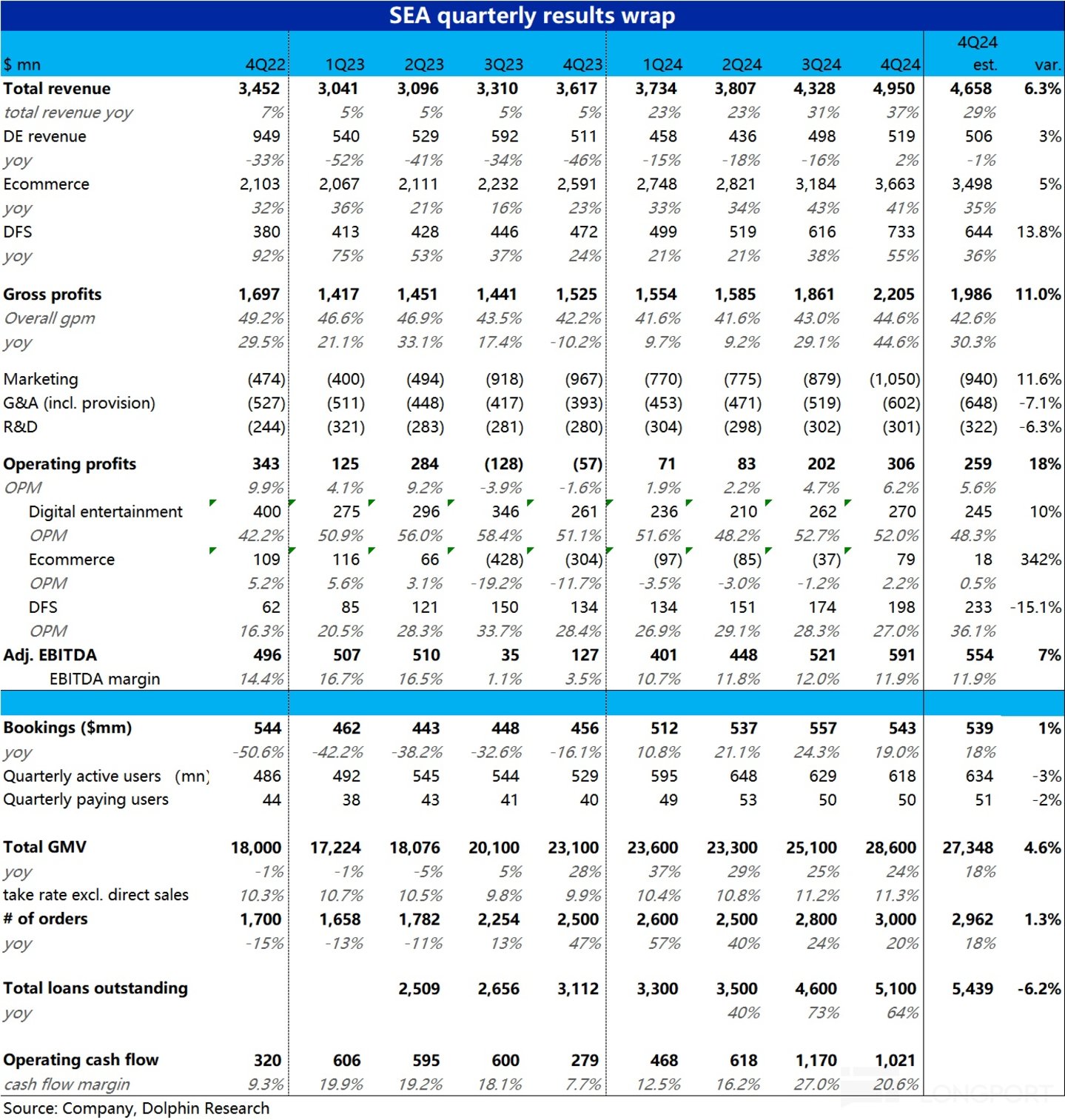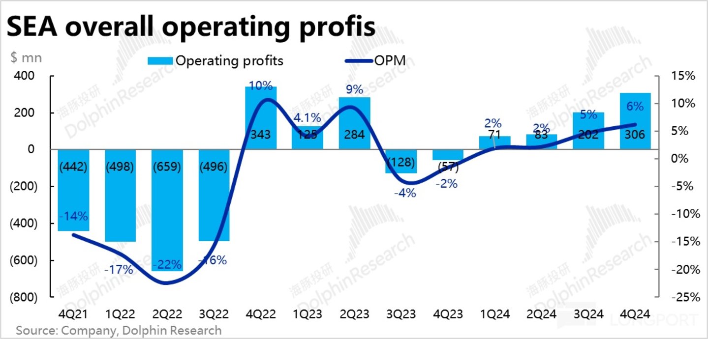 北京时间 3 月 4 日晚美股盘前,东南亚小腾讯$Sea.US 公布了 2024 年 4 季度财报,整体来看电商板块的增长和利润改善都好于预期,是最大亮点。但游戏和金融板块的底层经营指标实际有一些隐患,核心要点如下: