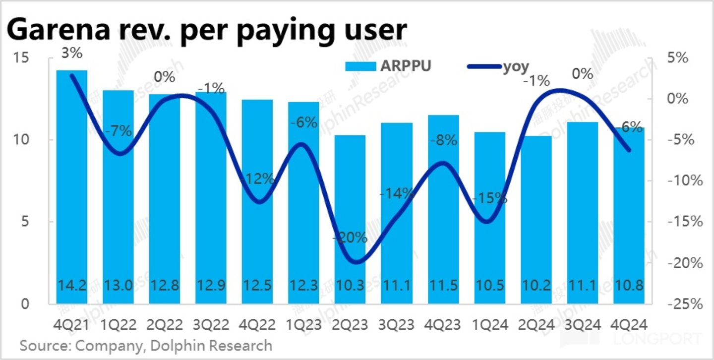 不过市场对流水的预期不算高,预期同比增速为 18%,环比减速整整 6pct。因此实际增长 19% 的表现,还是好于预期的。同样从价量的口径,本季付费用户数是环比持平的,但人均付费金额却由上季的同比持平,恶化到了本季同比-6%,是流水增长放缓的主要原因。因此整体来看,公司游戏业务的生态有再度走弱的迹象。