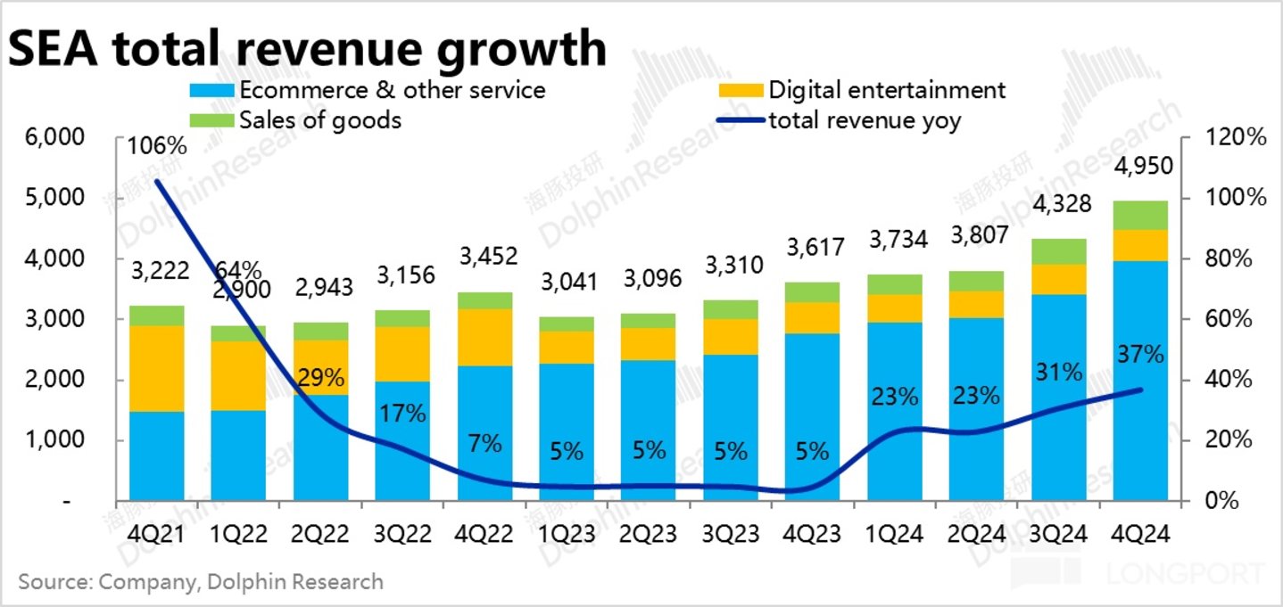 由于电商板块超预期强劲的增长,以及金融和游戏板块的虽然底层经营指标表现不算太好,但营收角度也是好于预期的,本季 Sea 整体实现收入 49.5 亿,同比增长 37%,增速再度环比走高 6pct,增长可谓相当强劲,但实际含金量没有看似的那么高。