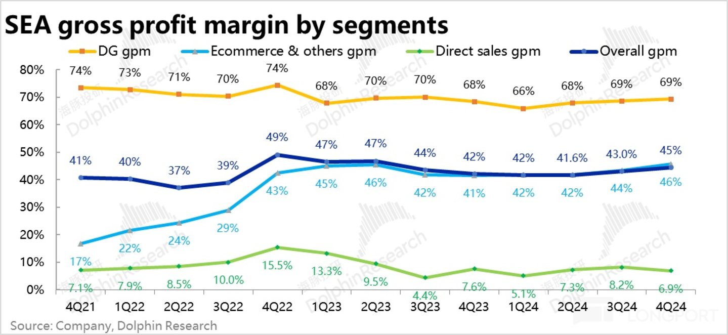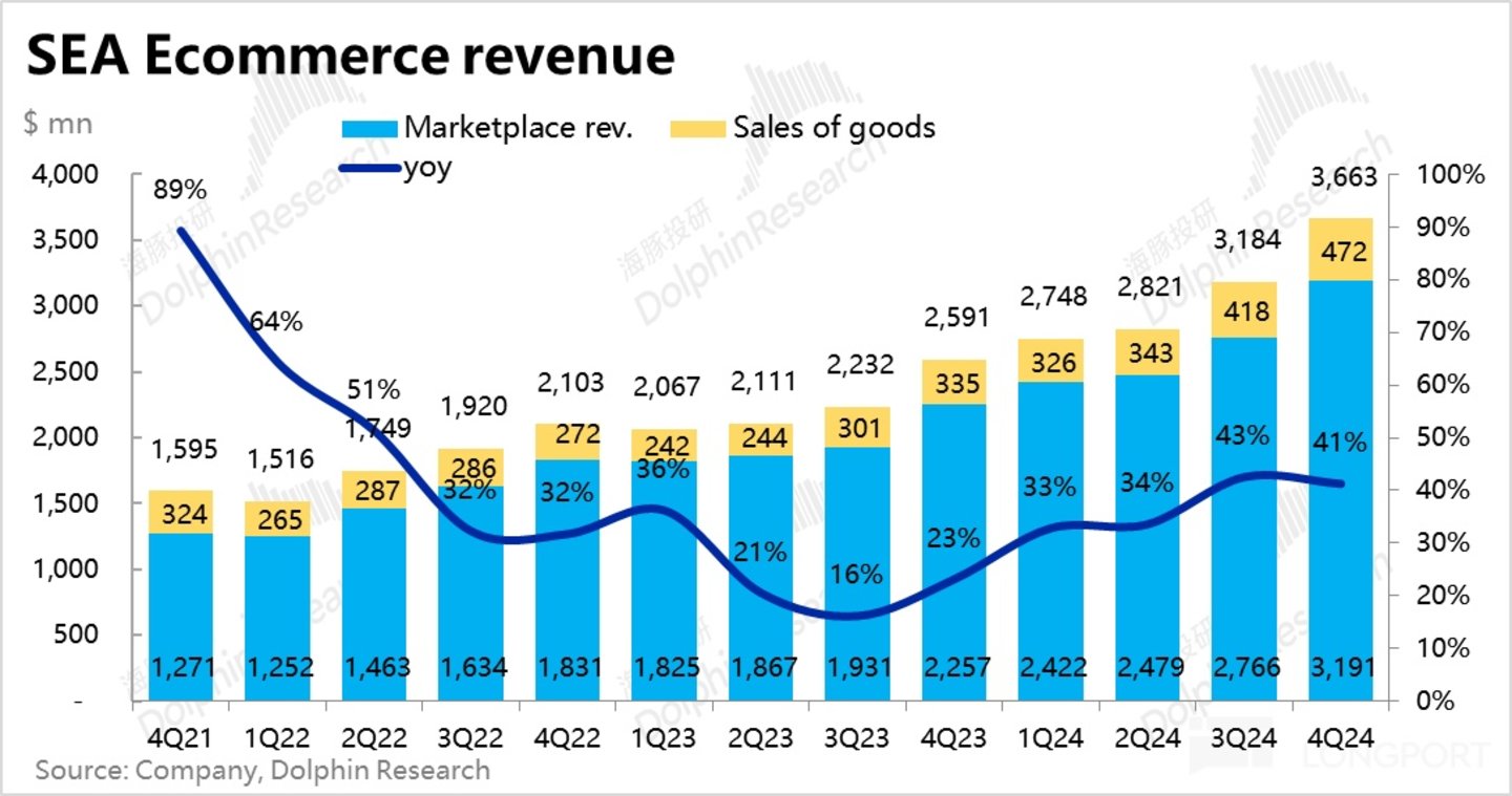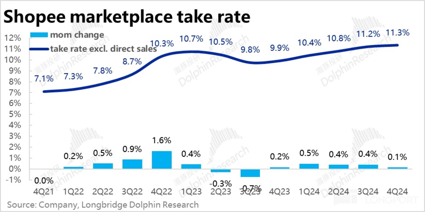 不过据海豚投研测算,Shopee平台业务的变现率本季环比的提升幅度仅为 0.1pct,是自 4Q23 变现率重启上升趋势以来,单季提升幅度最小的一次。不过具体看,高利润的 marketplace 服务的变现率依旧环比走高了 0.4pct,是 VAS(如配送费)等利润空间较低的收费项走低了 0.3pct,拖累了整体变现率的提升幅度,但由于高利润的 marketplace 变现仍是显著走高的,对电商板块利润率的提升的拖累会更小。