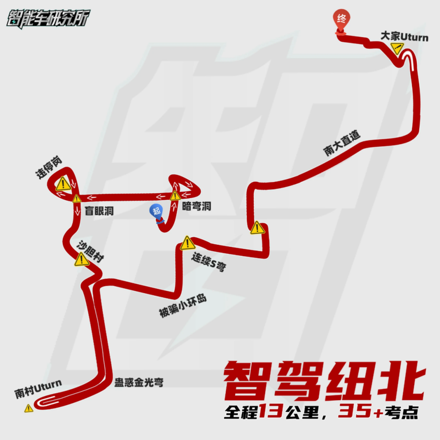 参考“智能车研究所”的评测,他们选择了一条由城中村小道、国道、高速路、无标识道路和掉头位组成的城市道路进行测试,智驾不仅要识别不那么准确的车道线、隐蔽的红绿灯,还要面对多个转弯和掉头,并时刻留意乱窜的电动车。
