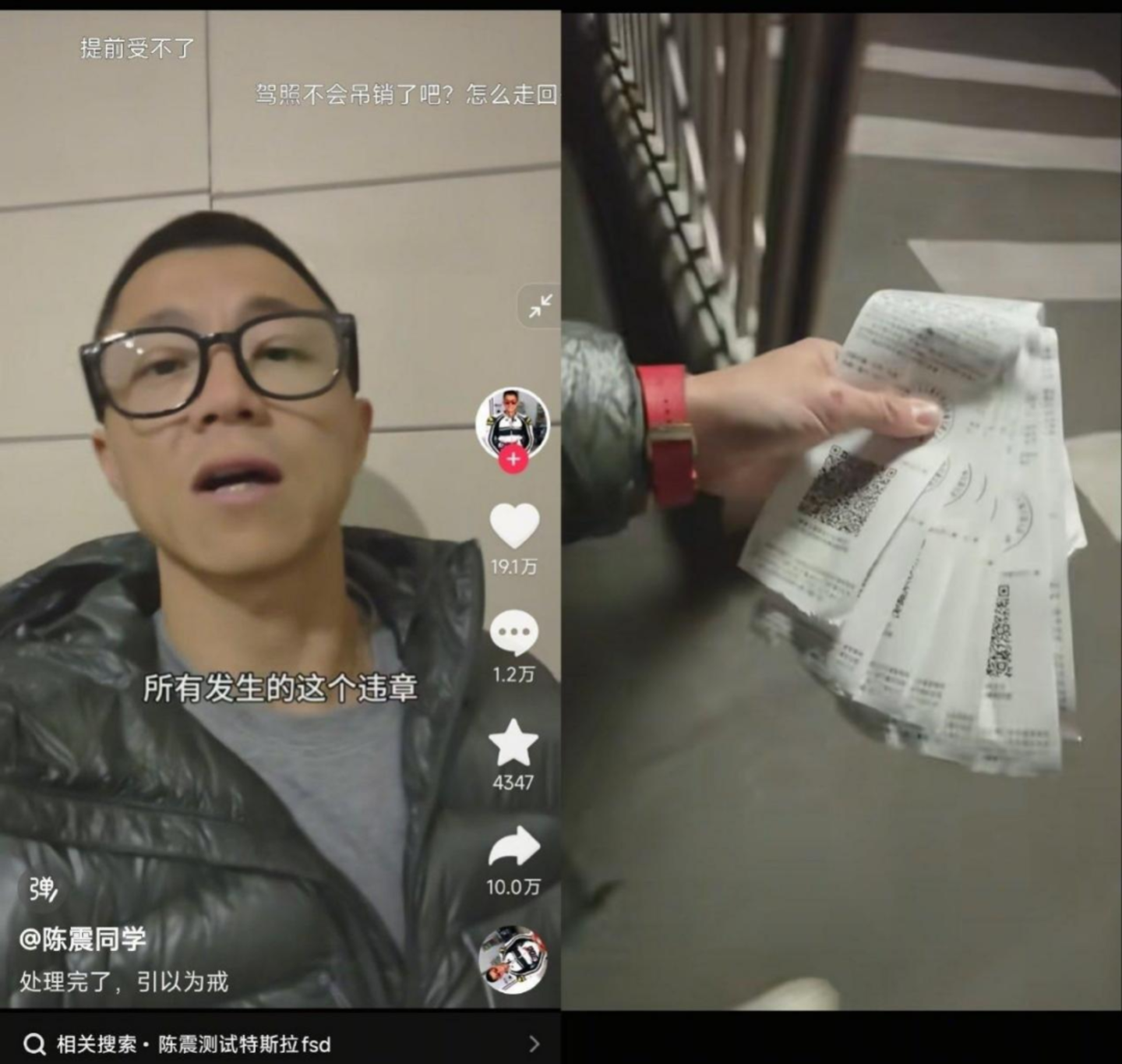 |陈震展示因测试FSD产生的罚单,图片来源:陈震抖音