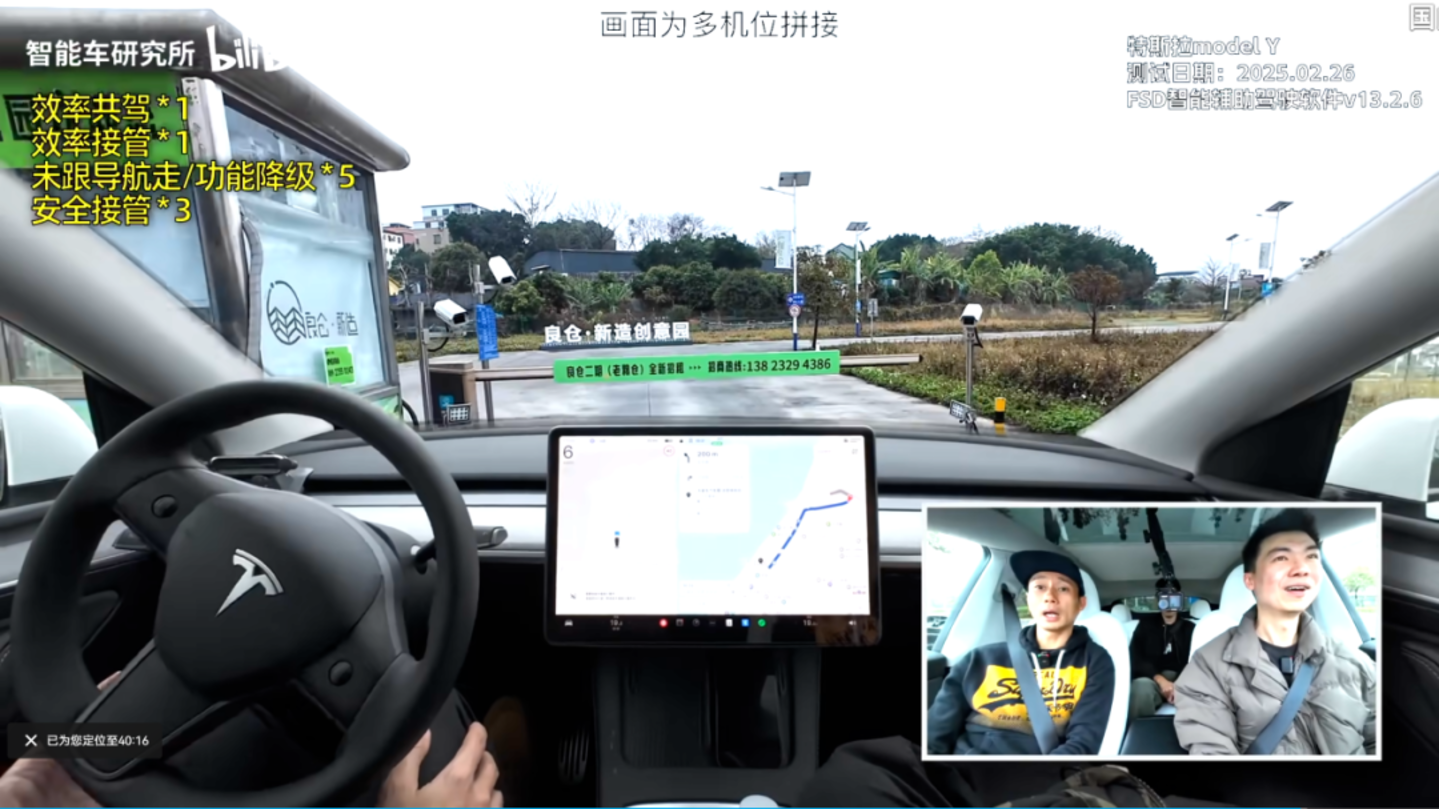特斯拉FSD这边,媒体的测试成绩是安全接管3次、未跟导航/功能降级5次、效率接管1次和效率共驾1次。