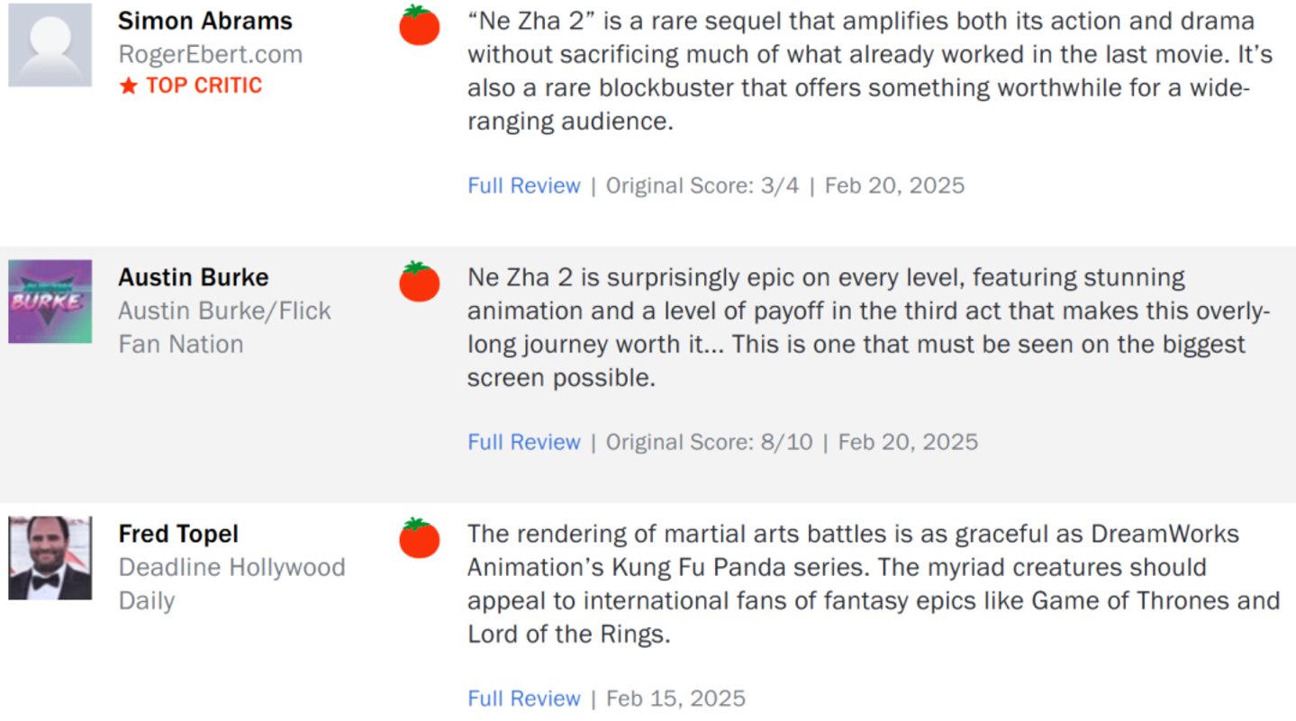 而《哪吒2》个位数的评论家评价,起码说明了两件事。第一,大多数北美媒体并不真正在乎这部电影,即使它的全球票房已经超过20亿美元,位居全球影史票房榜top7;第二,发行方并无请评论家评价的需求(或被拒绝),媒体们也不认为《哪吒2》是一个可以追逐报道的“重点”,毕竟其北美票房至今尚未超过2000万美元。
