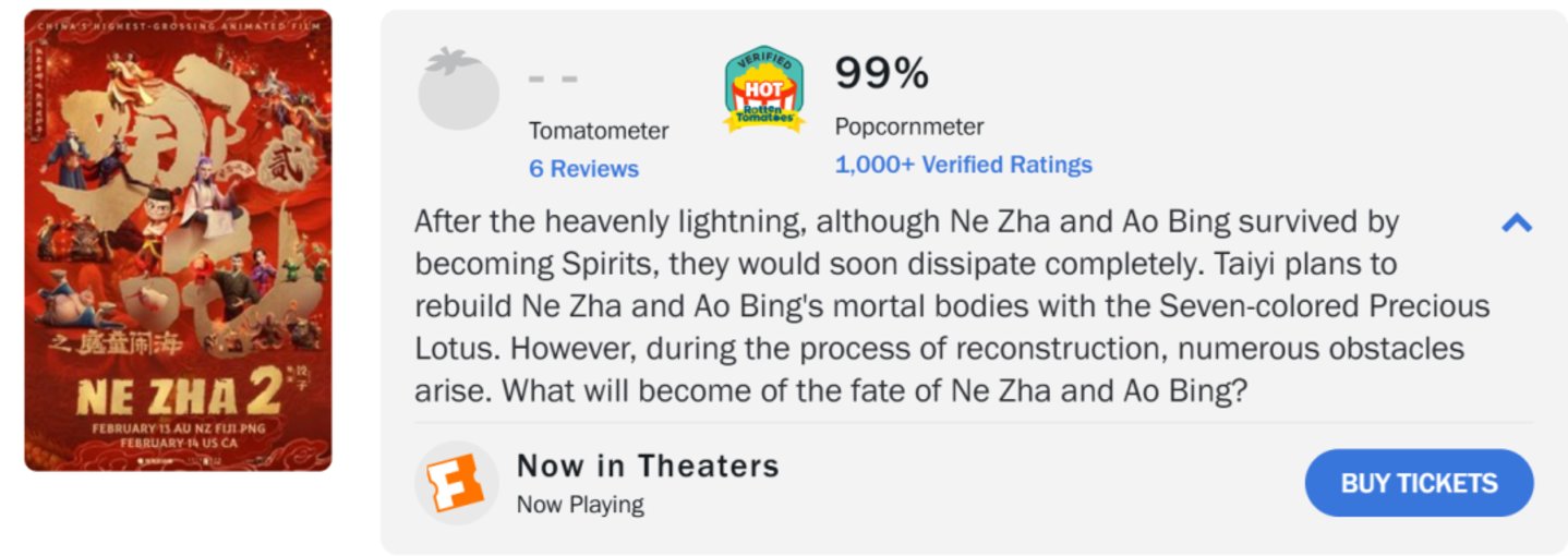 烂番茄上,1000+影迷为《哪吒2》打出了高达99%的爆米花指数。
