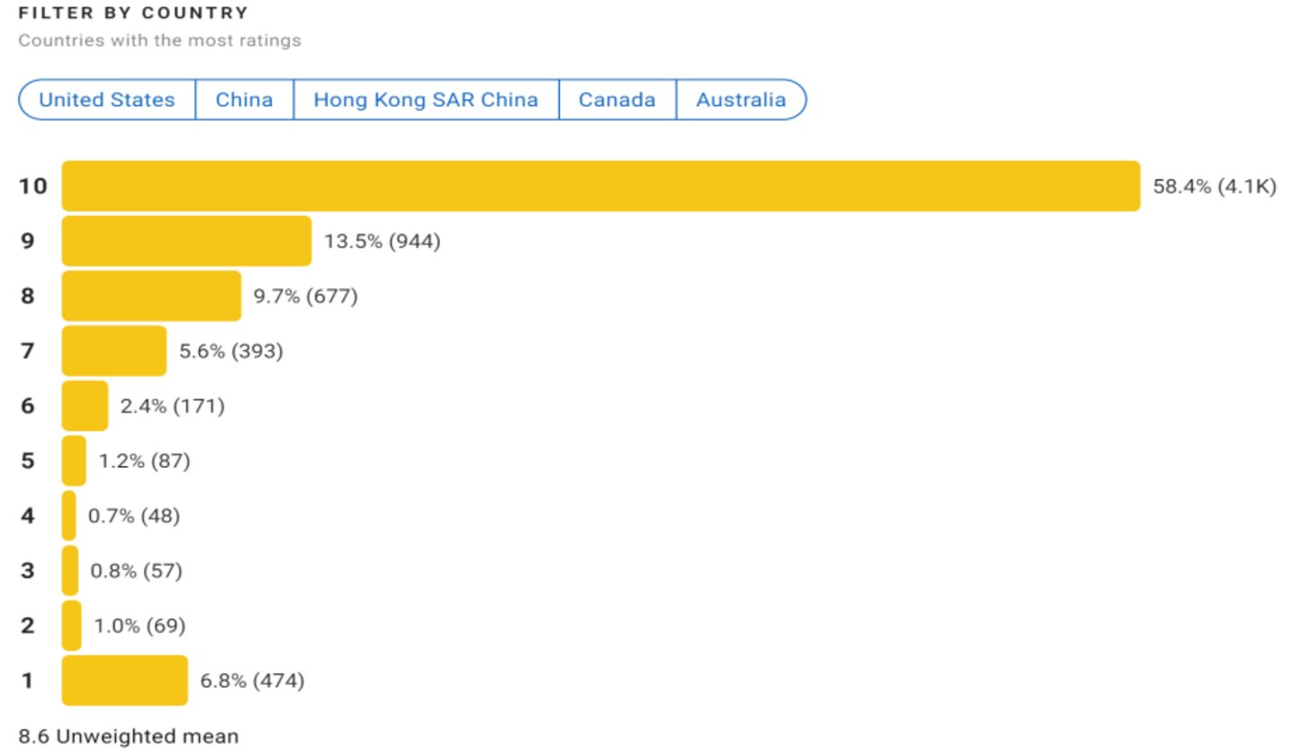 为《哪吒2》“打高分人数”位居前五名的国家和地区,分别是美国、中国、中国香港、加拿大和澳大利亚。可以看出,即使在IMDb上,中国影迷在IMDb占据不少比例,算是爱屋及乌后,充当另一种程度上的“水军”。