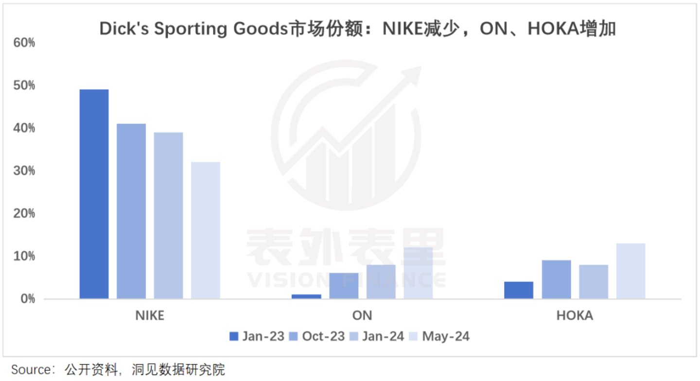 HOKA们产品种类繁多,品牌越来越大众化,与耐克“狭路相逢”:在美国运动用品零售店Dick's中,耐克与HOKA们的产品份额,此消彼长。