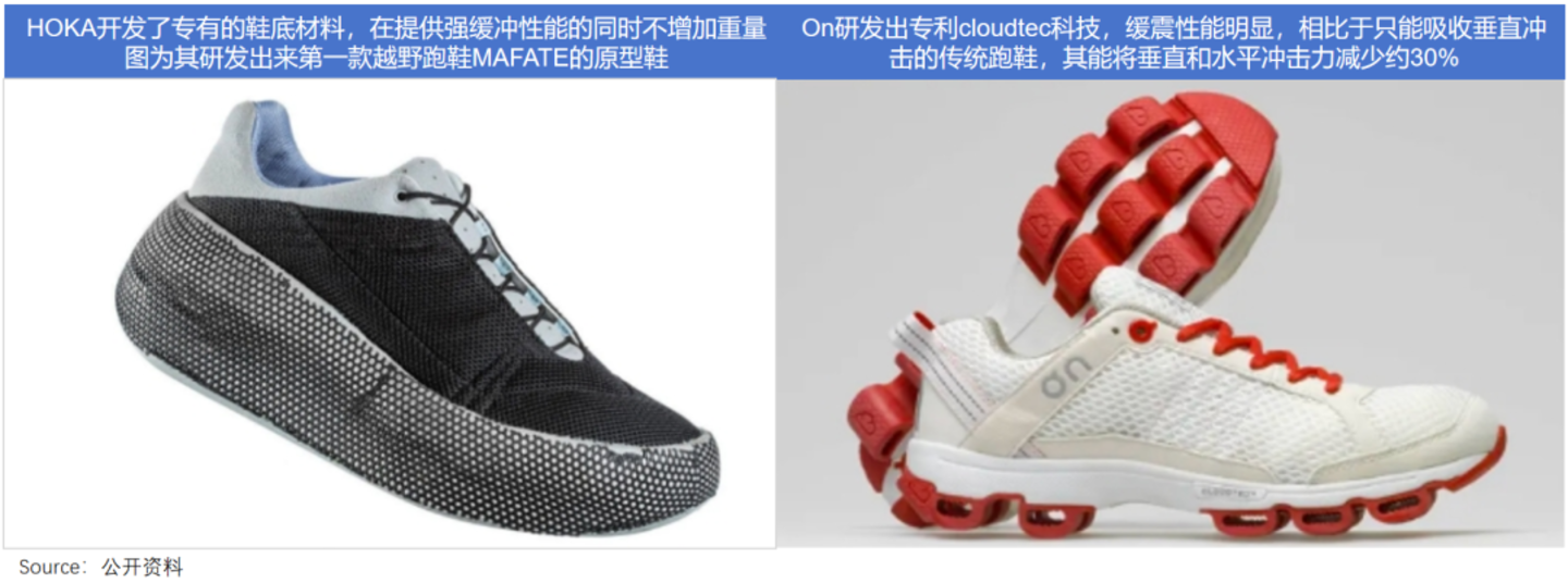HOKA创始人是越野跑冠军,留意到风靡一时的薄底鞋会对双脚造成损伤后,研发出轻量厚底技术增强缓冲,以保护运动者;与铁人三项运动息息相关的昂跑,也独创了CloudTec技术,大大提高鞋子的缓震性能。