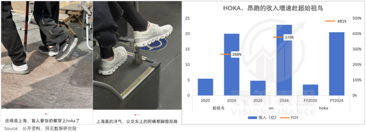 2024年,始祖鸟收入同比2020年大涨266%,但放在HOKA和昂跑面前,增速仍然逊色,差距达到一倍多。