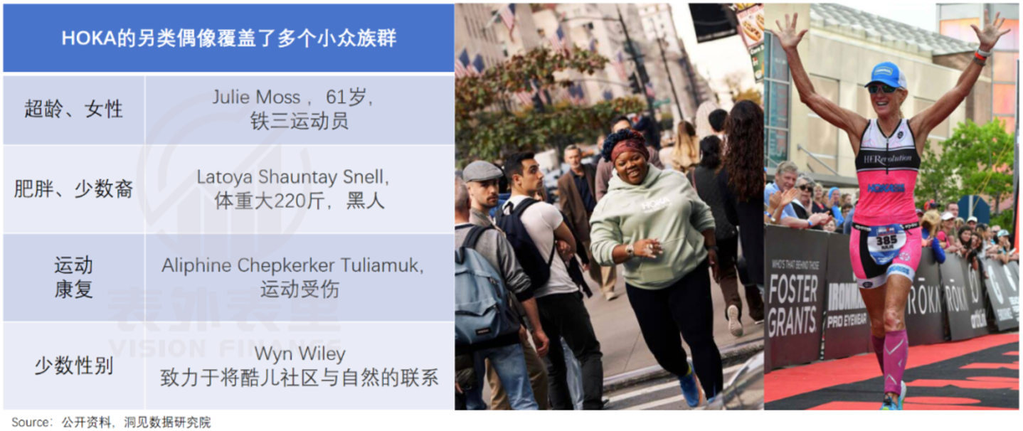 HOKA在做好“工具鞋”的基础上,进一步将目光投向了许多锻炼能力差的普通人群。其品牌大使,不是肤白貌美的明星或大满贯得主,而是超重的厨师、高龄铁人三项运动员等。