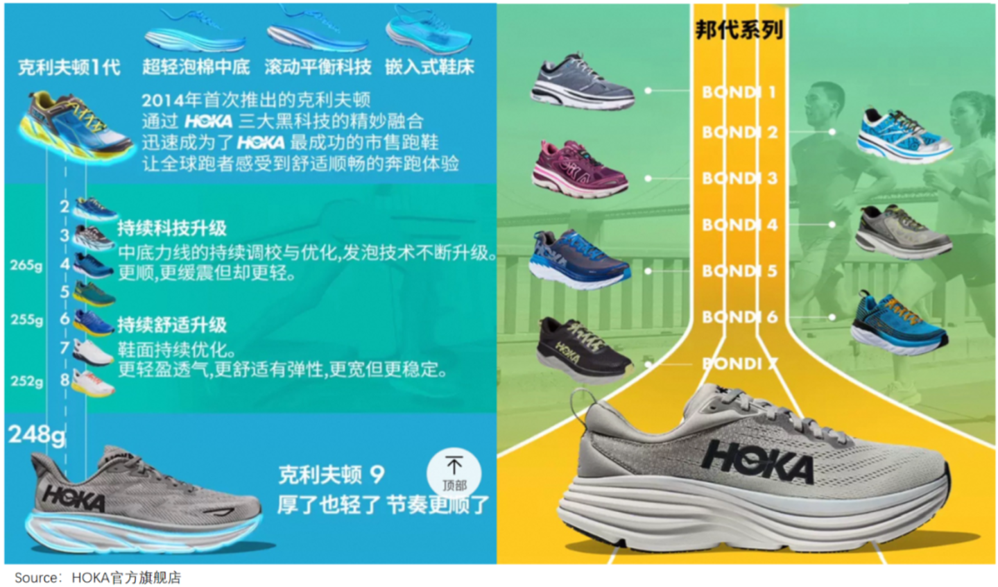 而HOKA的经典款,平均每年迭代1次,次次都设计新花样;昂跑更不必说,紧跟着潮流步伐更新。
