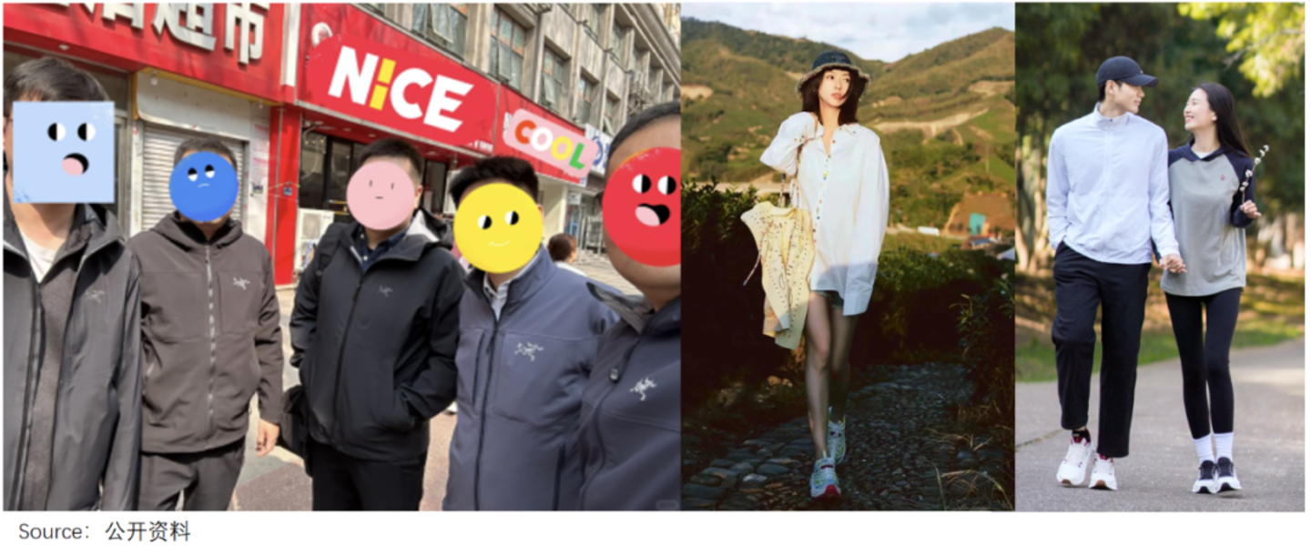 大哥们穿着撞款、甚至撞色的始祖鸟夹克聚会,一边感叹中年生活一地鸡毛,一边讨论如何搞钱;而HOKA和昂跑,被松弛感拉满的帅哥靓女踩在脚下,表演健康、时尚生活。