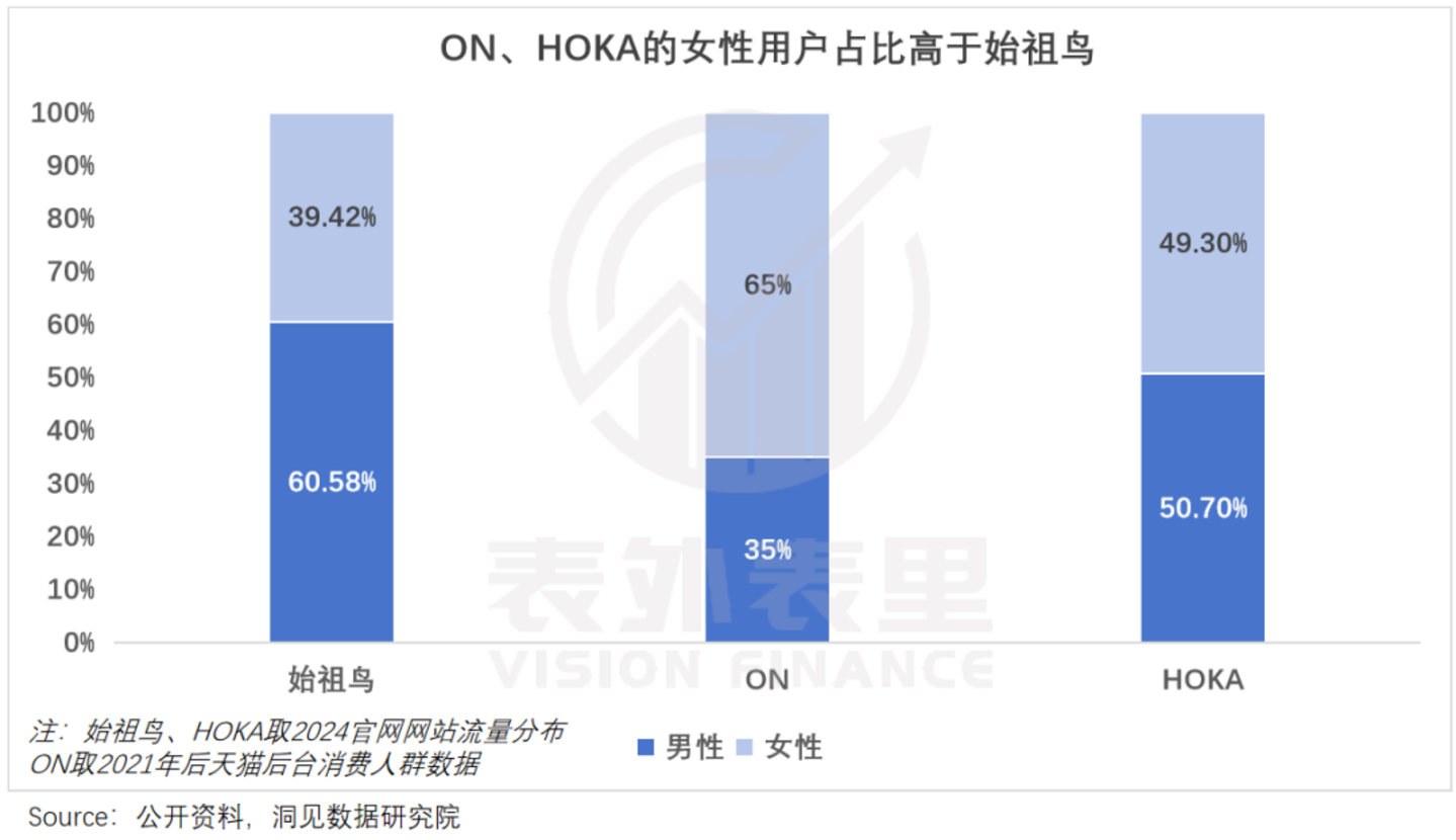 而始祖鸟仍保持了专业运动的基调,避开了来自大众运动圈层的正面竞争:以爱美的女性为例,HOKA用户中女性占比均接近50%,昂跑高达65%,而始祖鸟不到40%。