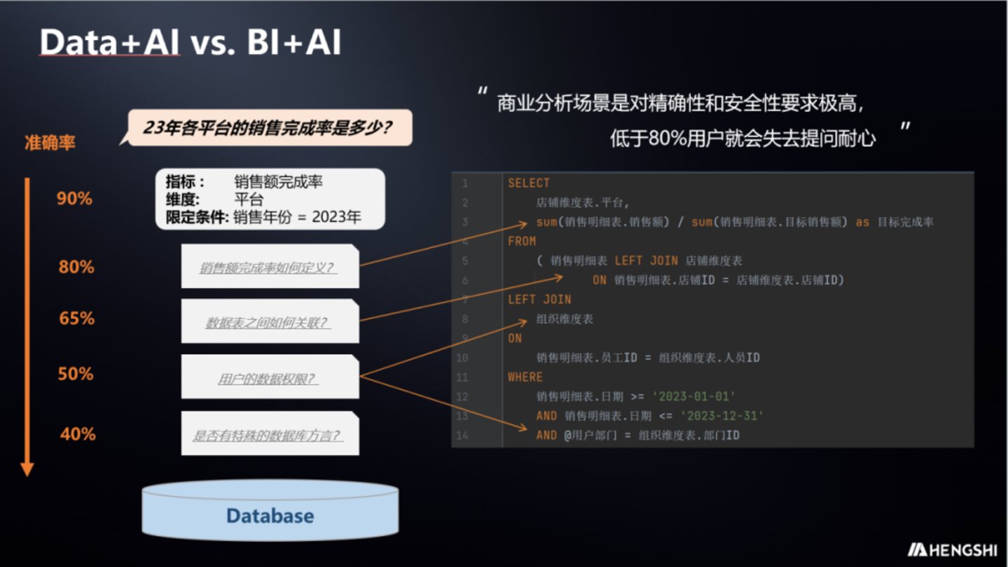 包括谷歌和 Databricks 在内的很多业界顶级数据团队进行过类似第一种方案的验证后,最终都没有得到理想的准确率,因此行业内大家的认知都逐渐转为 NL2DSL。这也是衡石一开始就采取的路线。事实上到目前为止,整个行业没有任何公司成功产品化落地了 NL2SQL 的方案,这个需求技术上超过了目前大模型的能力上限。