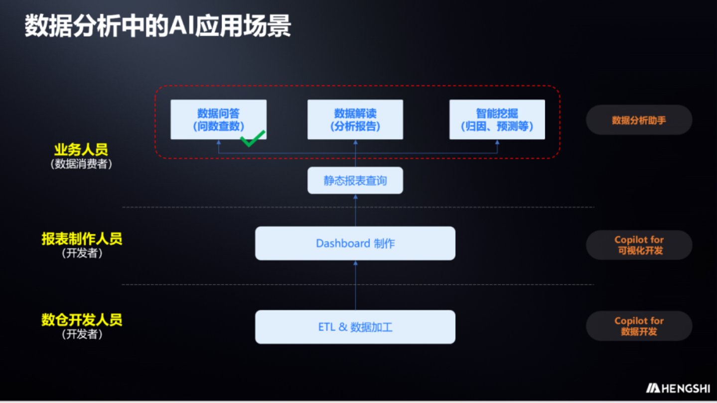 BI 的工作成果最核心的是数据的关联关系,所以衡石在 BI 形态上推出了 AI 助手,主要面向业务的运营人员或者商业分析师。因为在 BI 领域,AI 提问是一项很实用的技术。例如运营人员在查看报表时遇到问题,可以不依赖分析师或数据团队,而是通过语音或文字输入问题,快速获取具有商业价值的分析结果,这就大大降低了数据分析的门槛。