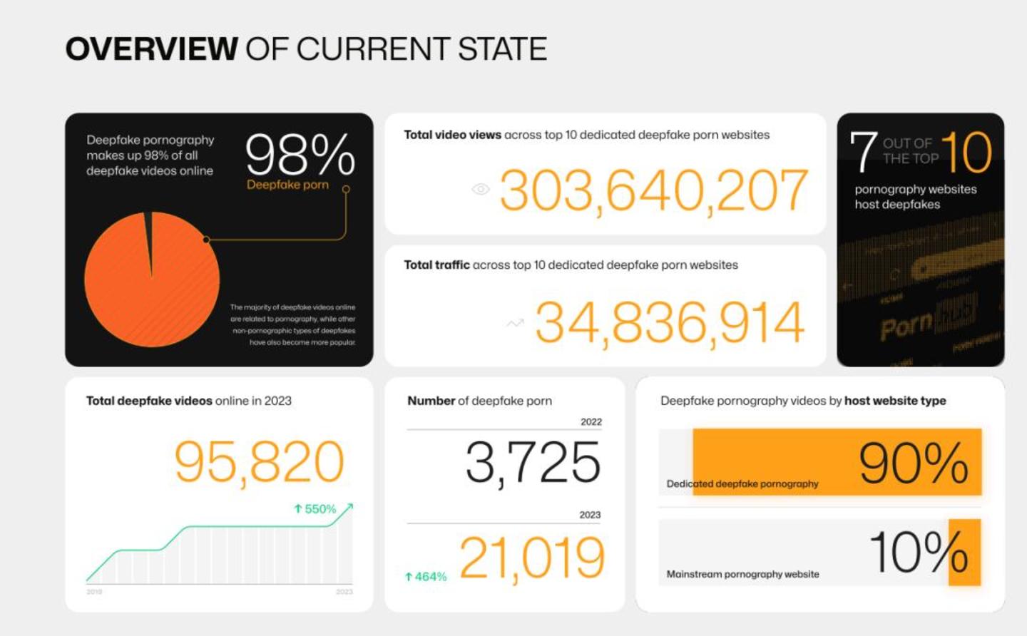 美国网络安全公司Home Security Heroes的一份报告显示,在互联网所有深度伪造视频中,几乎98%是深度伪造色情视频,前10个专门用于深度伪造色情内容的网站上,视频总访问量到超过3亿次,总观看次数超过3000万。